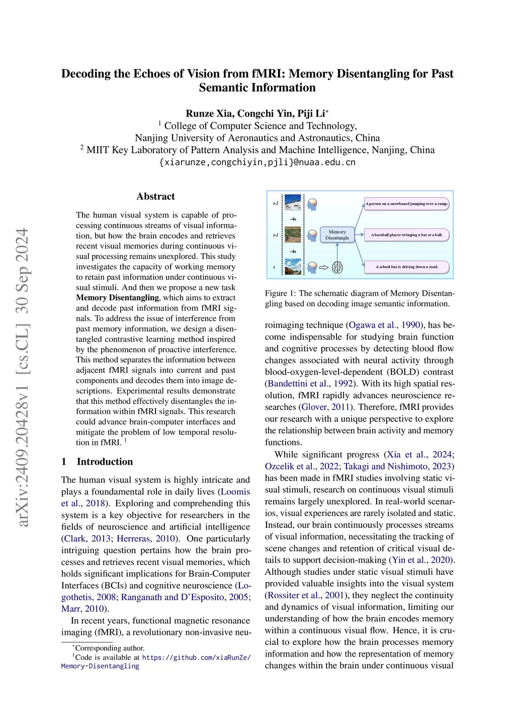 The human visual system is capable of processing continuous streams of visual information, but how the brain encodes and retrieves recent visual memories during continuous visual processing remains unexplored. This study investigates the capacity of working memory to retain past information under continuous visual stimuli. And then we propose a new task Memory Disentangling, which aims to extract and decode past information from fMRI signals. To address the issue of interference from past memory information, we design a disentangled contrastive learning method inspired by the phenomenon of proactive interference. This method separates the information between adjacent fMRI signals into current and past components and decodes them into image descriptions. Experimental results demonstrate that this method effectively disentangles the information within fMRI signals. This research could advance brain-computer interfaces and mitigate the problem of low temporal resolution in fMRI.