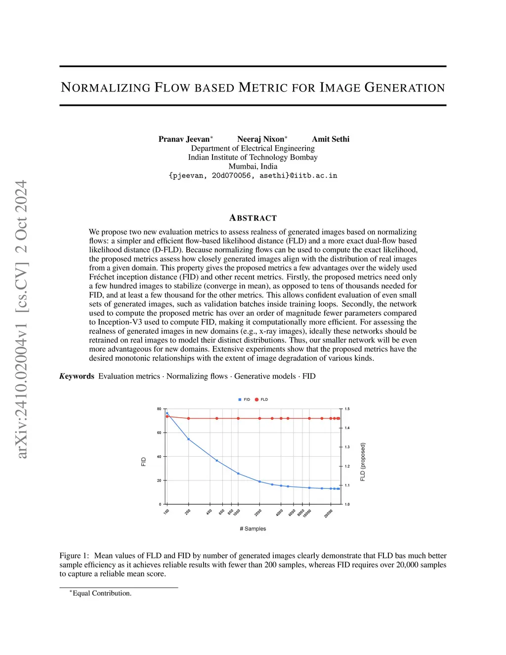 We propose two new evaluation metrics to assess realness of generated images based on normalizing flows: a simpler and efficient flow-based likelihood distance (FLD) and a more exact dual-flow based likelihood distance (D-FLD). Because normalizing flows can be used to compute the exact likelihood, the proposed metrics assess how closely generated images align with the distribution of real images from a given domain. This property gives the proposed metrics a few advantages over the widely used Fr\échet inception distance (FID) and other recent metrics. Firstly, the proposed metrics need only a few hundred images to stabilize (converge in mean), as opposed to tens of thousands needed for FID, and at least a few thousand for the other metrics. This allows confident evaluation of even small sets of generated images, such as validation batches inside training loops. Secondly, the network used to compute the proposed metric has over an order of magnitude fewer parameters compared to Inception-V3 used to compute FID, making it computationally more efficient. For assessing the realness of generated images in new domains (e.g., x-ray images), ideally these networks should be retrained on real images to model their distinct distributions. Thus, our smaller network will be even more advantageous for new domains. Extensive experiments show that the proposed metrics have the desired monotonic relationships with the extent of image degradation of various kinds.
