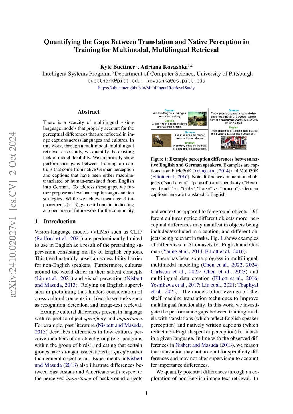 There is a scarcity of multilingual vision-language models that properly account for the perceptual differences that are reflected in image captions across languages and cultures. In this work, through a multimodal, multilingual retrieval case study, we quantify the existing lack of model flexibility. We empirically show performance gaps between training on captions that come from native German perception and captions that have been either machine-translated or human-translated from English into German. To address these gaps, we further propose and evaluate caption augmentation strategies. While we achieve mean recall improvements (+1.3), gaps still remain, indicating an open area of future work for the community.