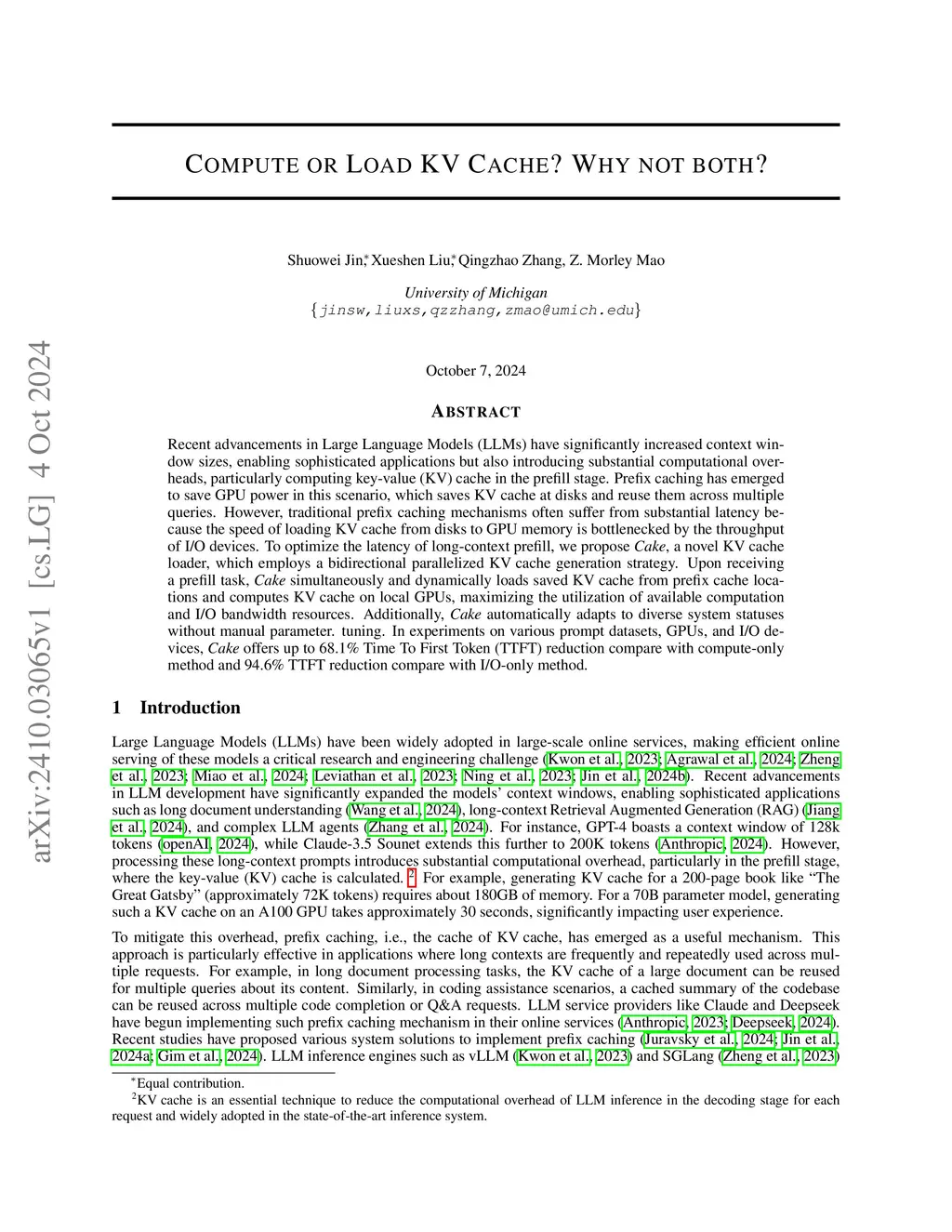 Large Language Models (LLMs) are increasingly deployed in large-scale online services, enabling sophisticated applications. However, the computational overhead of generating key-value (KV) caches in the prefill stage presents a major bottleneck, particularly for long-context inputs. Prefix caching mitigates this issue by storing KV caches for reuse, reducing redundant computation. Despite its advantages, prefix caching suffers from high latency due to the limited I/O bandwidth of storage devices, constraining inference efficiency. To address this challenge, we introduce Cake, a novel KV cache loading system that optimally utilizes both computational and I/O resources in parallel. Cake employs a bidirectional scheduling strategy that dynamically balances KV cache computation and loading, ensuring efficient resource utilization. Additionally, Cake incorporates an adaptive scheduling mechanism that seamlessly integrates with non-prefix caching requests, improving system throughput and adapting to fluctuating resource availabilty. Through extensive evaluations across various hardware configurations, datasets, and storage conditions, Cake achieves on average 2.6x reduction in Time to First Token (TTFT) compared to compute-only and I/O-only methods. Our findings highlight Cake as an effective and practical solution for optimizing long-context LLM inference, bridging the gap between computation and I/O efficiency in large-scale AI deployments.