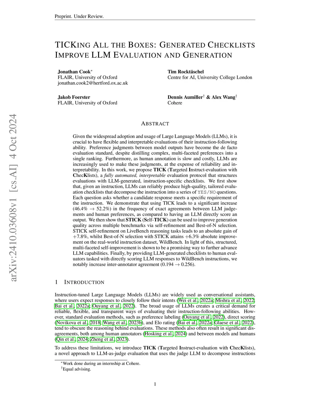 Given the widespread adoption and usage of Large Language Models (LLMs), it is crucial to have flexible and interpretable evaluations of their instruction-following ability. Preference judgments between model outputs have become the de facto evaluation standard, despite distilling complex, multi-faceted preferences into a single ranking. Furthermore, as human annotation is slow and costly, LLMs are increasingly used to make these judgments, at the expense of reliability and interpretability. In this work, we propose TICK (Targeted Instruct-evaluation with ChecKlists), a fully automated, interpretable evaluation protocol that structures evaluations with LLM-generated, instruction-specific checklists. We first show that, given an instruction, LLMs can reliably produce high-quality, tailored evaluation checklists that decompose the instruction into a series of YES/NO questions. Each question asks whether a candidate response meets a specific requirement of the instruction. We demonstrate that using TICK leads to a significant increase (46.4% 52.2%) in the frequency of exact agreements between LLM judgements and human preferences, as compared to having an LLM directly score an output. We then show that STICK (Self-TICK) can be used to improve generation quality across multiple benchmarks via self-refinement and Best-of-N selection. STICK self-refinement on LiveBench reasoning tasks leads to an absolute gain of 7.8%, whilst Best-of-N selection with STICK attains 6.3% absolute improvement on the real-world instruction dataset, WildBench. In light of this, structured, multi-faceted self-improvement is shown to be a promising way to further advance LLM capabilities. Finally, by providing LLM-generated checklists to human evaluators tasked with directly scoring LLM responses to WildBench instructions, we notably increase inter-annotator agreement (0.194 0.256).