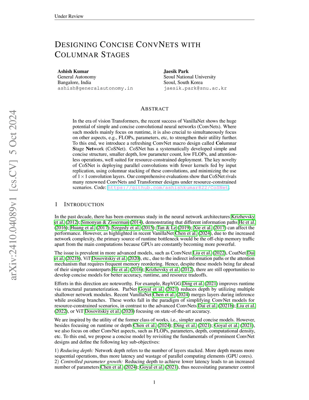 In the era of vision Transformers, the recent success of VanillaNet shows the huge potential of simple and concise convolutional neural networks (ConvNets). Where such models mainly focus on runtime, it is also crucial to simultaneously focus on other aspects, e.g., FLOPs, parameters, etc, to strengthen their utility further. To this end, we introduce a refreshing ConvNet macro design called Columnar Stage Network (CoSNet). CoSNet has a systematically developed simple and concise structure, smaller depth, low parameter count, low FLOPs, and attention-less operations, well suited for resource-constrained deployment. The key novelty of CoSNet is deploying parallel convolutions with fewer kernels fed by input replication, using columnar stacking of these convolutions, and minimizing the use of 1x1 convolution layers. Our comprehensive evaluations show that CoSNet rivals many renowned ConvNets and Transformer designs under resource-constrained scenarios. Code:this https URL