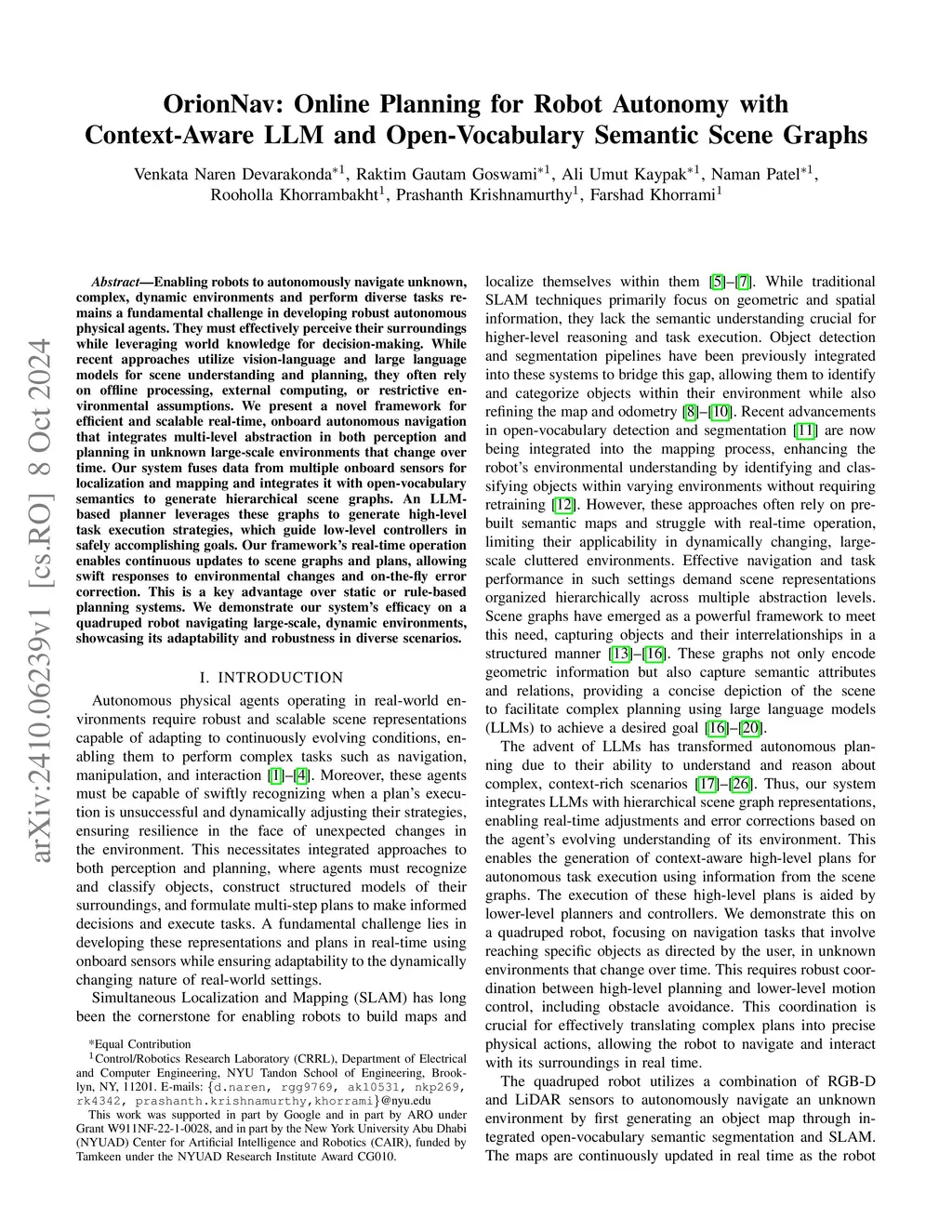 Enabling robots to autonomously navigate unknown, complex, dynamic environments and perform diverse tasks remains a fundamental challenge in developing robust autonomous physical agents. These agents must effectively perceive their surroundings while leveraging world knowledge for decision-making. Although recent approaches utilize vision-language and large language models for scene understanding and planning, they often rely on offline processing, offboard compute, make simplifying assumptions about the environment and perception, limiting real-world applicability. We present a novel framework for real-time onboard autonomous navigation in unknown environments that change over time by integrating multi-level abstraction in both perception and planning pipelines. Our system fuses data from multiple onboard sensors for localization and mapping and integrates it with open-vocabulary semantics to generate hierarchical scene graphs from continuously updated semantic object map. The LLM-based planner uses these graphs to create multi-step plans that guide low-level controllers in executing navigation tasks specified in natural language. The system's real-time operation enables the LLM to adjust its plans based on updates to the scene graph and task execution status, ensuring continuous adaptation to new situations or when the current plan cannot accomplish the task, a key advantage over static or rule-based systems. We demonstrate our system's efficacy on a quadruped navigating dynamic environments, showcasing its adaptability and robustness in diverse scenarios.