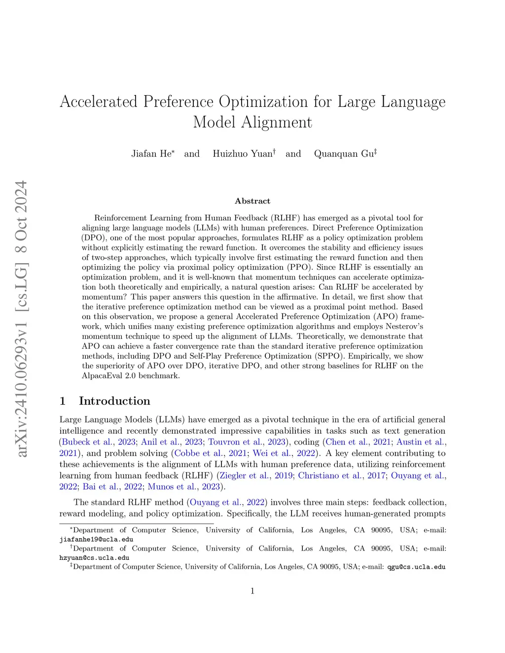 Reinforcement Learning from Human Feedback (RLHF) has emerged as a pivotal tool for aligning large language models (LLMs) with human preferences. Direct Preference Optimization (DPO), one of the most popular approaches, formulates RLHF as a policy optimization problem without explicitly estimating the reward function. It overcomes the stability and efficiency issues of two-step approaches, which typically involve first estimating the reward function and then optimizing the policy via proximal policy optimization (PPO). Since RLHF is essentially an optimization problem, and it is well-known that momentum techniques can accelerate optimization both theoretically and empirically, a natural question arises: Can RLHF be accelerated by momentum? This paper answers this question in the affirmative. In detail, we first show that the iterative preference optimization method can be viewed as a proximal point method. Based on this observation, we propose a general Accelerated Preference Optimization (APO) framework, which unifies many existing preference optimization algorithms and employs Nesterov's momentum technique to speed up the alignment of LLMs. Theoretically, we demonstrate that APO can achieve a faster convergence rate than the standard iterative preference optimization methods, including DPO and Self-Play Preference Optimization (SPPO). Empirically, we show the superiority of APO over DPO, iterative DPO, and other strong baselines for RLHF on the AlpacaEval 2.0 benchmark.