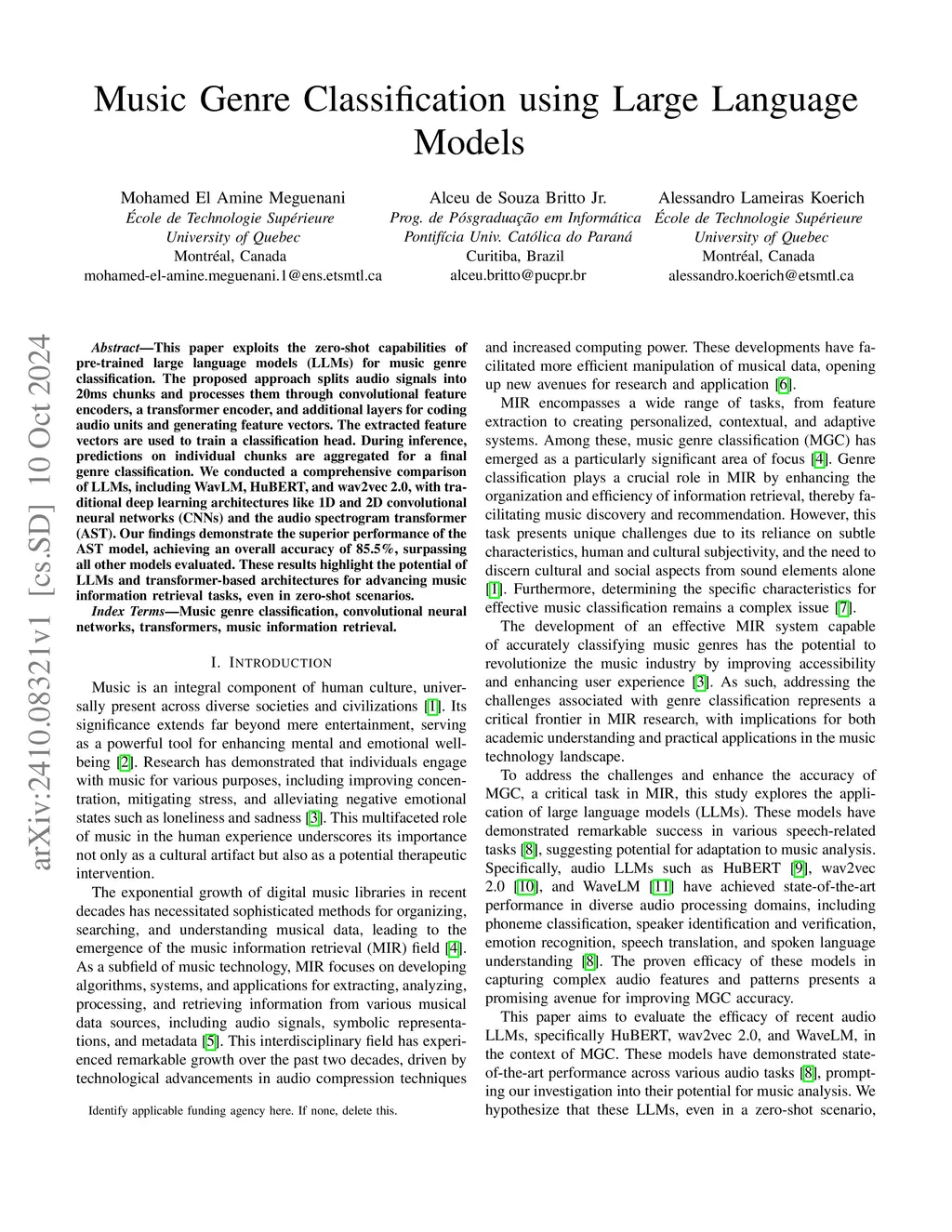 This paper exploits the zero-shot capabilities of pre-trained large language models (LLMs) for music genre classification. The proposed approach splits audio signals into 20 ms chunks and processes them through convolutional feature encoders, a transformer encoder, and additional layers for coding audio units and generating feature vectors. The extracted feature vectors are used to train a classification head. During inference, predictions on individual chunks are aggregated for a final genre classification. We conducted a comprehensive comparison of LLMs, including WavLM, HuBERT, and wav2vec 2.0, with traditional deep learning architectures like 1D and 2D convolutional neural networks (CNNs) and the audio spectrogram transformer (AST). Our findings demonstrate the superior performance of the AST model, achieving an overall accuracy of 85.5%, surpassing all other models evaluated. These results highlight the potential of LLMs and transformer-based architectures for advancing music information retrieval tasks, even in zero-shot scenarios.