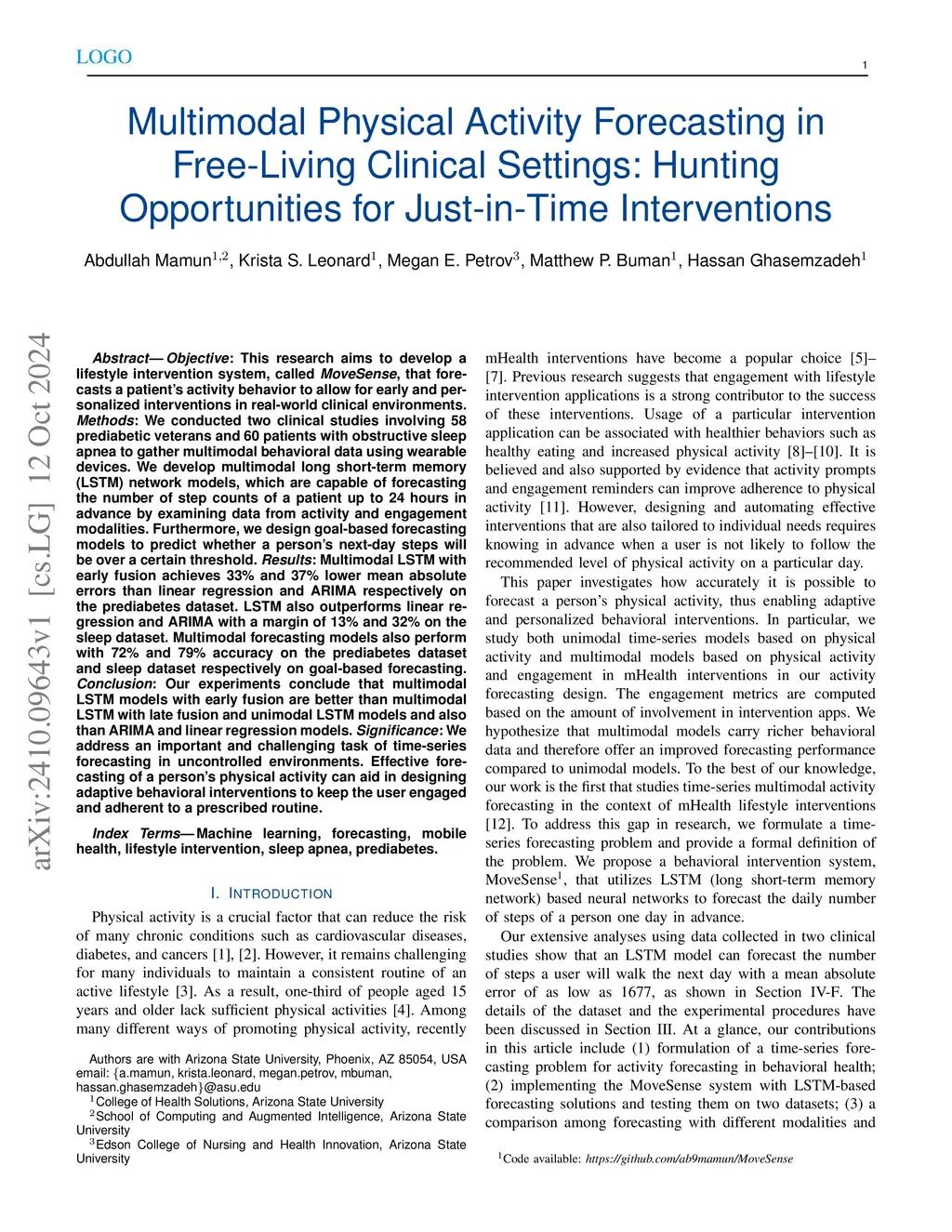 Objective: This research aims to develop a lifestyle intervention system, called MoveSense, that forecasts a patient's activity behavior to allow for early and personalized interventions in real-world clinical environments. Methods: We conducted two clinical studies involving 58 prediabetic veterans and 60 patients with obstructive sleep apnea to gather multimodal behavioral data using wearable devices. We develop multimodal long short-term memory (LSTM) network models, which are capable of forecasting the number of step counts of a patient up to 24 hours in advance by examining data from activity and engagement modalities. Furthermore, we design goal-based forecasting models to predict whether a person's next-day steps will be over a certain threshold. Results: Multimodal LSTM with early fusion achieves 33% and 37% lower mean absolute errors than linear regression and ARIMA respectively on the prediabetes dataset. LSTM also outperforms linear regression and ARIMA with a margin of 13% and 32% on the sleep dataset. Multimodal forecasting models also perform with 72% and 79% accuracy on the prediabetes dataset and sleep dataset respectively on goal-based forecasting. Conclusion: Our experiments conclude that multimodal LSTM models with early fusion are better than multimodal LSTM with late fusion and unimodal LSTM models and also than ARIMA and linear regression models. Significance: We address an important and challenging task of time-series forecasting in uncontrolled environments. Effective forecasting of a person's physical activity can aid in designing adaptive behavioral interventions to keep the user engaged and adherent to a prescribed routine.