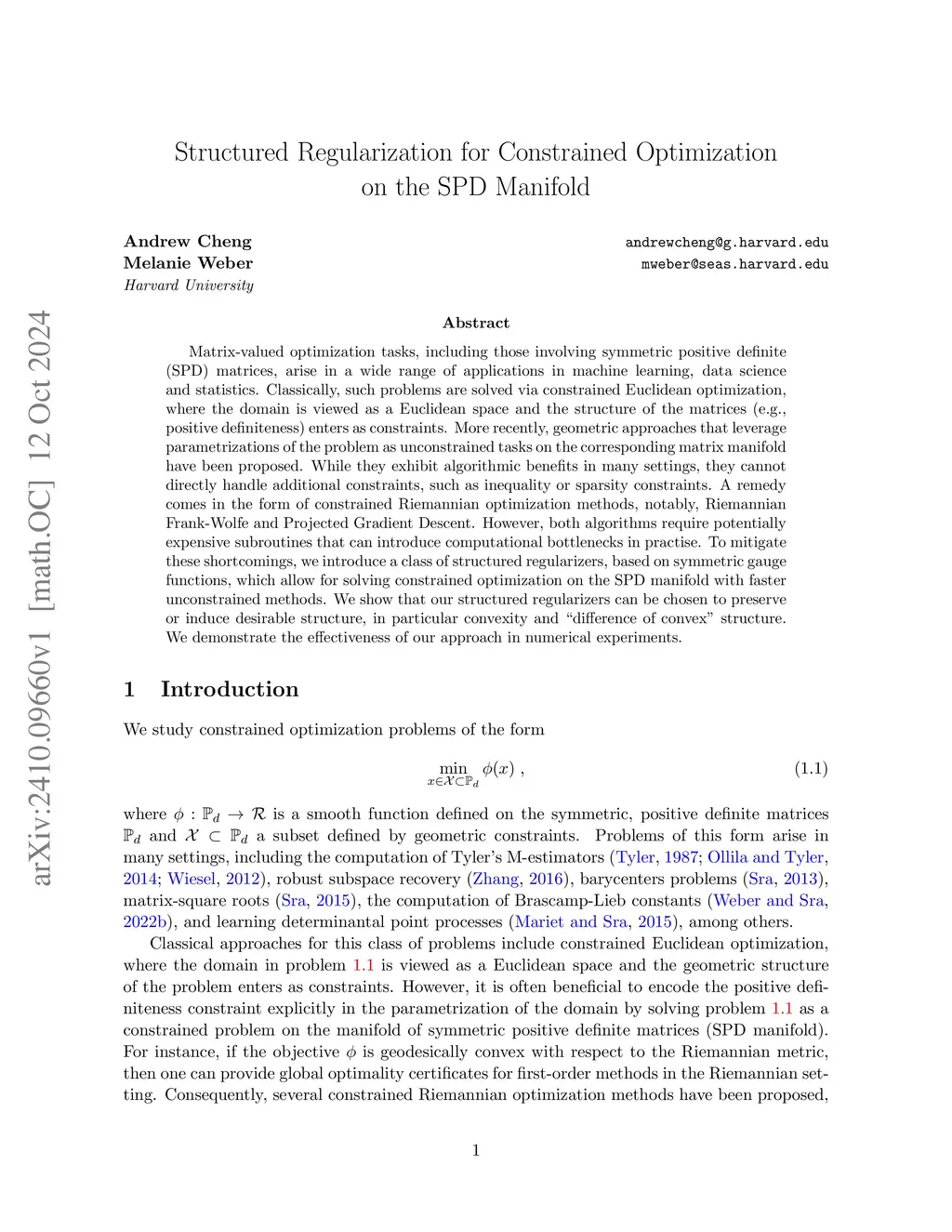 Matrix-valued optimization tasks, including those involving symmetric positive definite (SPD) matrices, arise in a wide range of applications in machine learning, data science and statistics. Classically, such problems are solved via constrained Euclidean optimization, where the domain is viewed as a Euclidean space and the structure of the matrices (e.g., positive definiteness) enters as constraints. More recently, geometric approaches that leverage parametrizations of the problem as unconstrained tasks on the corresponding matrix manifold have been proposed. While they exhibit algorithmic benefits in many settings, they cannot directly handle additional constraints, such as inequality or sparsity constraints. A remedy comes in the form of constrained Riemannian optimization methods, notably, Riemannian Frank-Wolfe and Projected Gradient Descent. However, both algorithms require potentially expensive subroutines that can introduce computational bottlenecks in practise. To mitigate these shortcomings, we introduce a class of structured regularizers, based on symmetric gauge functions, which allow for solving constrained optimization on the SPD manifold with faster unconstrained methods. We show that our structured regularizers can be chosen to preserve or induce desirable structure, in particular convexity and "difference of convex" structure. We demonstrate the effectiveness of our approach in numerical experiments.