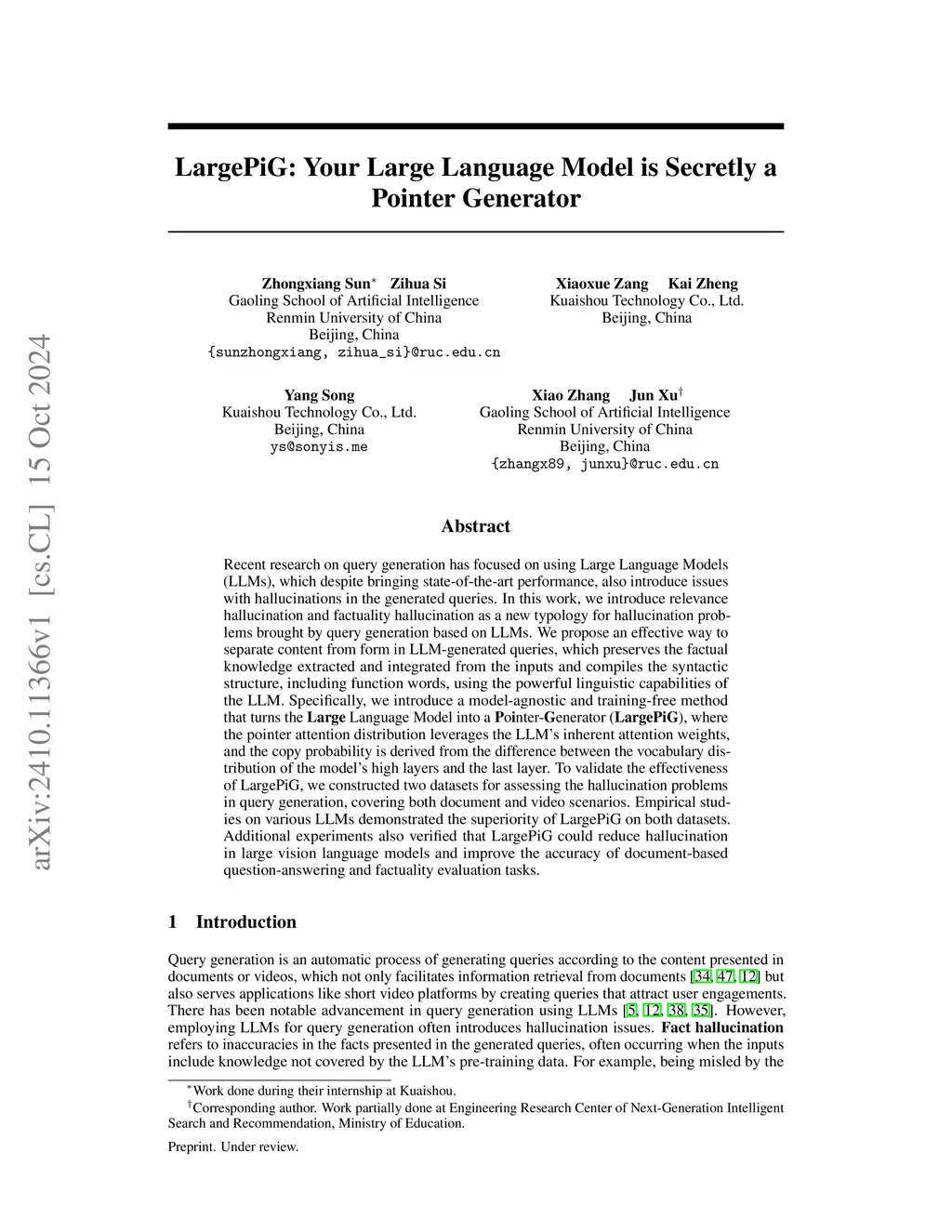 Recent research on query generation has focused on using Large Language Models (LLMs), which despite bringing state-of-the-art performance, also introduce issues with hallucinations in the generated queries. In this work, we introduce relevance hallucination and factuality hallucination as a new typology for hallucination problems brought by query generation based on LLMs. We propose an effective way to separate content from form in LLM-generated queries, which preserves the factual knowledge extracted and integrated from the inputs and compiles the syntactic structure, including function words, using the powerful linguistic capabilities of the LLM. Specifically, we introduce a model-agnostic and training-free method that turns the Large Language Model into a Pointer-Generator (LargePiG), where the pointer attention distribution leverages the LLM's inherent attention weights, and the copy probability is derived from the difference between the vocabulary distribution of the model's high layers and the last layer. To validate the effectiveness of LargePiG, we constructed two datasets for assessing the hallucination problems in query generation, covering both document and video scenarios. Empirical studies on various LLMs demonstrated the superiority of LargePiG on both datasets. Additional experiments also verified that LargePiG could reduce hallucination in large vision language models and improve the accuracy of document-based question-answering and factuality evaluation tasks.