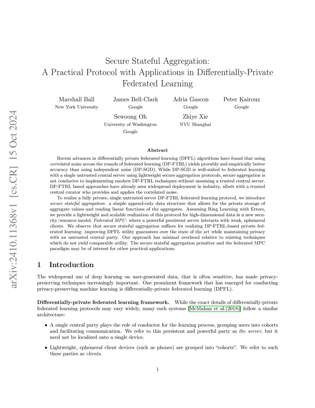 Recent advances in differentially private federated learning (DPFL) algorithms have found that using correlated noise across the rounds of federated learning (DP-FTRL) yields provably and empirically better accuracy than using independent noise (DP-SGD). While DP-SGD is well-suited to federated learning with a single untrusted central server using lightweight secure aggregation protocols, secure aggregation is not conducive to implementing modern DP-FTRL techniques without assuming a trusted central server. DP-FTRL based approaches have already seen widespread deployment in industry, albeit with a trusted central curator who provides and applies the correlated noise. To realize a fully private, single untrusted server DP-FTRL federated learning protocol, we introduce secure stateful aggregation: a simple append-only data structure that allows for the private storage of aggregate values and reading linear functions of the aggregates. Assuming Ring Learning with Errors, we provide a lightweight and scalable realization of this protocol for high-dimensional data in a new security/resource model, Federated MPC : where a powerful persistent server interacts with weak, ephemeral clients. We observe that secure stateful aggregation suffices for realizing DP-FTRL-based private federated learning: improving DPFL utility guarantees over the state of the art while maintaining privacy with an untrusted central party. Our approach has minimal overhead relative to existing techniques which do not yield comparable utility. The secure stateful aggregation primitive and the federated MPC paradigm may be of interest for other practical applications.