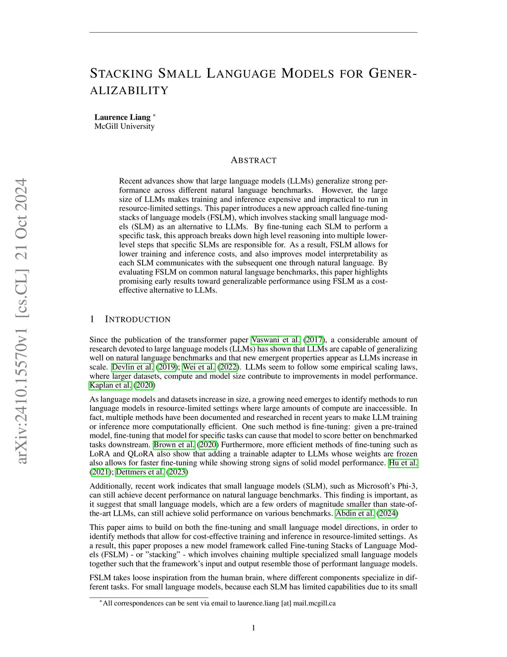 Recent advances show that large language models (LLMs) generalize strong performance across different natural language benchmarks. However, the large size of LLMs makes training and inference expensive and impractical to run in resource-limited settings. This paper introduces a new approach called fine-tuning stacks of language models (FSLM), which involves stacking small language models (SLM) as an alternative to LLMs. By fine-tuning each SLM to perform a specific task, this approach breaks down high level reasoning into multiple lower-level steps that specific SLMs are responsible for. As a result, FSLM allows for lower training and inference costs, and also improves model interpretability as each SLM communicates with the subsequent one through natural language. By evaluating FSLM on common natural language benchmarks, this paper highlights promising early results toward generalizable performance using FSLM as a cost-effective alternative to LLMs.