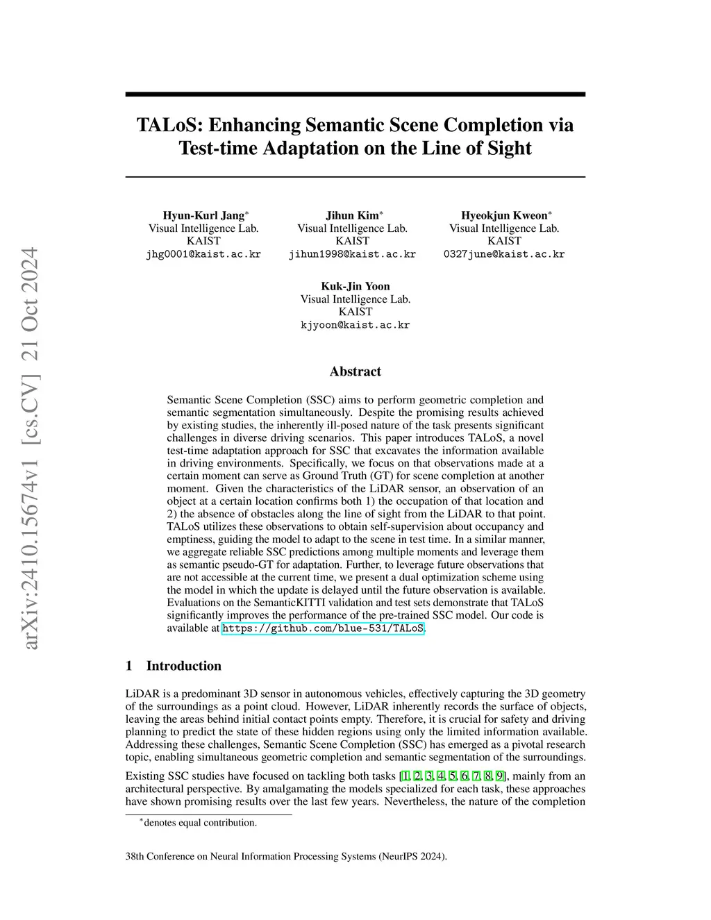 Semantic Scene Completion (SSC) aims to perform geometric completion and semantic segmentation simultaneously. Despite the promising results achieved by existing studies, the inherently ill-posed nature of the task presents significant challenges in diverse driving scenarios. This paper introduces TALoS, a novel test-time adaptation approach for SSC that excavates the information available in driving environments. Specifically, we focus on that observations made at a certain moment can serve as Ground Truth (GT) for scene completion at another moment. Given the characteristics of the LiDAR sensor, an observation of an object at a certain location confirms both 1) the occupation of that location and 2) the absence of obstacles along the line of sight from the LiDAR to that point. TALoS utilizes these observations to obtain self-supervision about occupancy and emptiness, guiding the model to adapt to the scene in test time. In a similar manner, we aggregate reliable SSC predictions among multiple moments and leverage them as semantic pseudo-GT for adaptation. Further, to leverage future observations that are not accessible at the current time, we present a dual optimization scheme using the model in which the update is delayed until the future observation is available. Evaluations on the SemanticKITTI validation and test sets demonstrate that TALoS significantly improves the performance of the pre-trained SSC model. Our code is available at https://github.com/blue-531/TALoS.