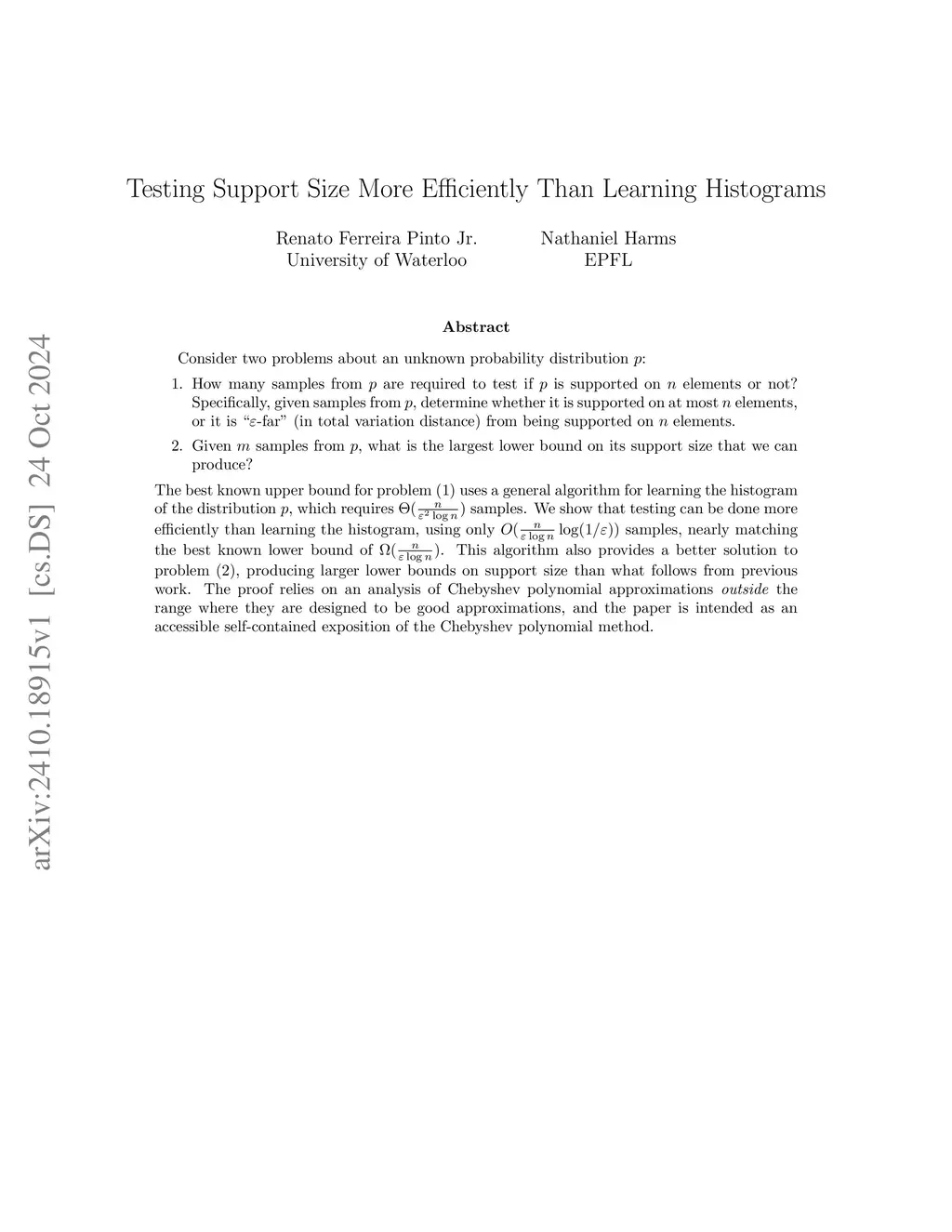 Consider two problems about an unknown probability distribution :1. How many samples from are required to test if is supported on elements or not? Specifically, given samples from , determine whether it is supported on at most elements, or it is "-far" (in total variation distance) from being supported on elements.2. Given samples from , what is the largest lower bound on its support size that we can produce?The best known upper bound for problem (1) uses a general algorithm for learning the histogram of the distribution , which requires samples. We show that testing can be done more efficiently than learning the histogram, using only samples, nearly matching the best known lower bound of . This algorithm also provides a better solution to problem (2), producing larger lower bounds on support size than what follows from previous work. The proof relies on an analysis of Chebyshev polynomial approximations outside the range where they are designed to be good approximations, and the paper is intended as an accessible self-contained exposition of the Chebyshev polynomial method.