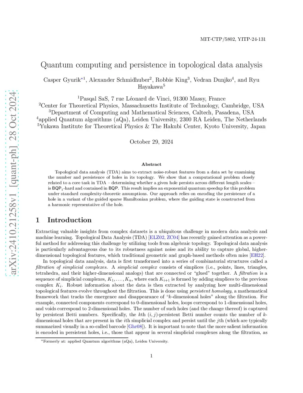 Quantum computing and persistence in topological data analysis