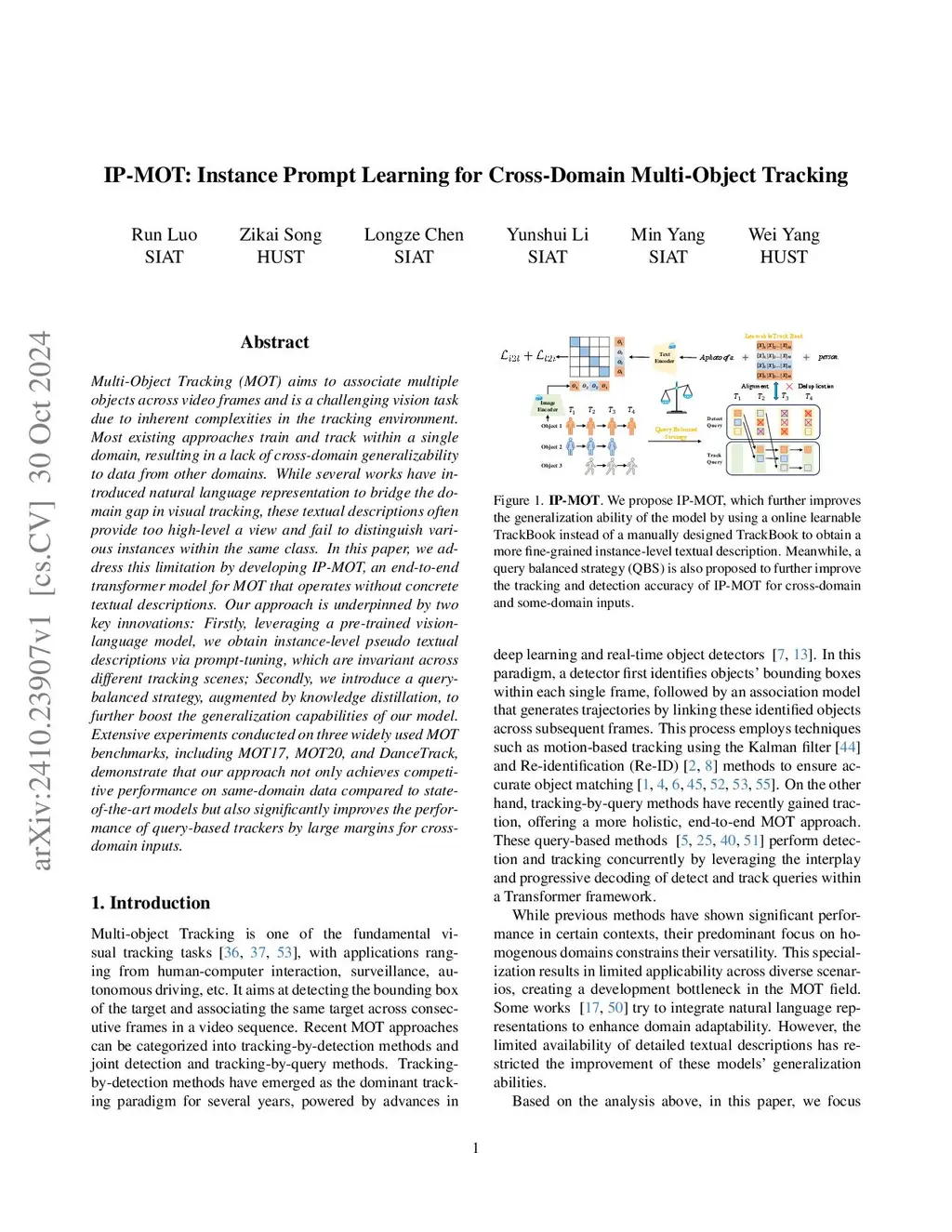 Multi-Object Tracking (MOT) aims to associate multiple objects across video frames and is a challenging vision task due to inherent complexities in the tracking environment. Most existing approaches train and track within a single domain, resulting in a lack of cross-domain generalizability to data from other domains. While several works have introduced natural language representation to bridge the domain gap in visual tracking, these textual descriptions often provide too high-level a view and fail to distinguish various instances within the same class. In this paper, we address this limitation by developing IP-MOT, an end-to-end transformer model for MOT that operates without concrete textual descriptions. Our approach is underpinned by two key innovations: Firstly, leveraging a pre-trained vision-language model, we obtain instance-level pseudo textual descriptions via prompt-tuning, which are invariant across different tracking scenes; Secondly, we introduce a query-balanced strategy, augmented by knowledge distillation, to further boost the generalization capabilities of our model. Extensive experiments conducted on three widely used MOT benchmarks, including MOT17, MOT20, and DanceTrack, demonstrate that our approach not only achieves competitive performance on same-domain data compared to state-of-the-art models but also significantly improves the performance of query-based trackers by large margins for cross-domain inputs.