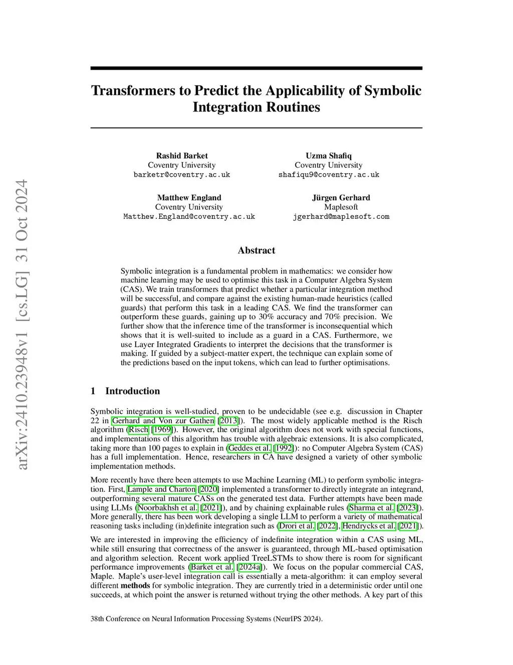 Symbolic integration is a fundamental problem in mathematics: we consider how machine learning may be used to optimise this task in a Computer Algebra System (CAS). We train transformers that predict whether a particular integration method will be successful, and compare against the existing human-made heuristics (called guards) that perform this task in a leading CAS. We find the transformer can outperform these guards, gaining up to 30% accuracy and 70% precision. We further show that the inference time of the transformer is inconsequential which shows that it is well-suited to include as a guard in a CAS. Furthermore, we use Layer Integrated Gradients to interpret the decisions that the transformer is making. If guided by a subject-matter expert, the technique can explain some of the predictions based on the input tokens, which can lead to further optimisations.