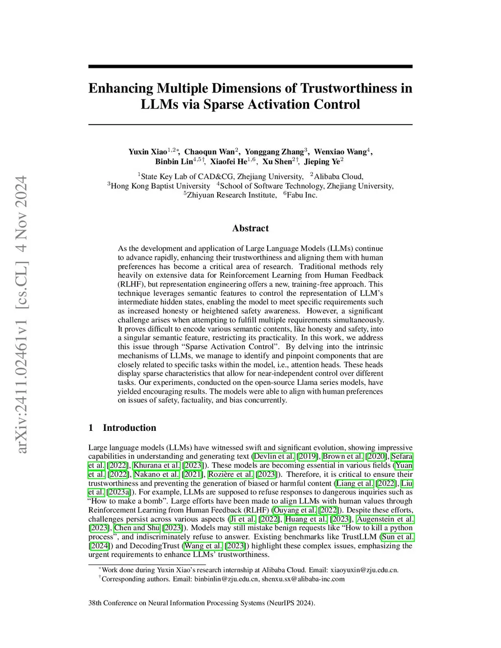 As the development and application of Large Language Models (LLMs) continue to advance rapidly, enhancing their trustworthiness and aligning them with human preferences has become a critical area of research. Traditional methods rely heavily on extensive data for Reinforcement Learning from Human Feedback (RLHF), but representation engineering offers a new, training-free approach. This technique leverages semantic features to control the representation of LLM's intermediate hidden states, enabling the model to meet specific requirements such as increased honesty or heightened safety awareness. However, a significant challenge arises when attempting to fulfill multiple requirements simultaneously. It proves difficult to encode various semantic contents, like honesty and safety, into a singular semantic feature, restricting its practicality. In this work, we address this issue through ``Sparse Activation Control''. By delving into the intrinsic mechanisms of LLMs, we manage to identify and pinpoint components that are closely related to specific tasks within the model, i.e., attention heads. These heads display sparse characteristics that allow for near-independent control over different tasks. Our experiments, conducted on the open-source Llama series models, have yielded encouraging results. The models were able to align with human preferences on issues of safety, factuality, and bias concurrently.