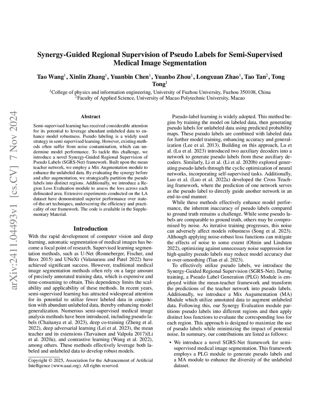Semi-supervised learning has received considerable attention for its potential to leverage abundant unlabeled data to enhance model robustness. Pseudo labeling is a widely used strategy in semi supervised learning. However, existing methods often suffer from noise contamination, which can undermine model performance. To tackle this challenge, we introduce a novel Synergy-Guided Regional Supervision of Pseudo Labels (SGRS-Net) framework. Built upon the mean teacher network, we employ a Mix Augmentation module to enhance the unlabeled data. By evaluating the synergy before and after augmentation, we strategically partition the pseudo labels into distinct regions. Additionally, we introduce a Region Loss Evaluation module to assess the loss across each delineated area. Extensive experiments conducted on the LA dataset have demonstrated superior performance over state-of-the-art techniques, underscoring the efficiency and practicality of our framework.
