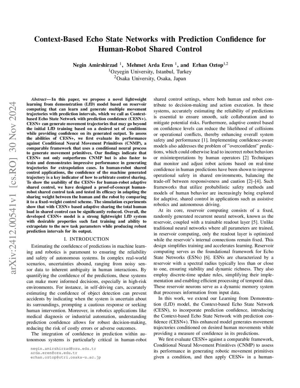 In this paper, we propose a novel lightweight learning from demonstration (LfD) model based on reservoir computing that can learn and generate multiple movement trajectories with prediction intervals, which we call as Context-based Echo State Network with prediction confidence (CESN+). CESN+ can generate movement trajectories that may go beyond the initial LfD training based on a desired set of conditions while providing confidence on its generated output. To assess the abilities of CESN+, we first evaluate its performance against Conditional Neural Movement Primitives (CNMP), a comparable framework that uses a conditional neural process to generate movement primitives. Our findings indicate that CESN+ not only outperforms CNMP but is also faster to train and demonstrates impressive performance in generating trajectories for extrapolation cases. In human-robot shared control applications, the confidence of the machine generated trajectory is a key indicator of how to arbitrate control sharing. To show the usability of the CESN+ for human-robot adaptive shared control, we have designed a proof-of-concept human-robot shared control task and tested its efficacy in adapting the sharing weight between the human and the robot by comparing it to a fixed-weight control scheme. The simulation experiments show that with CESN+ based adaptive sharing the total human load in shared control can be significantly reduced. Overall, the developed CESN+ model is a strong lightweight LfD system with desirable properties such fast training and ability to extrapolate to the new task parameters while producing robust prediction intervals for its output.