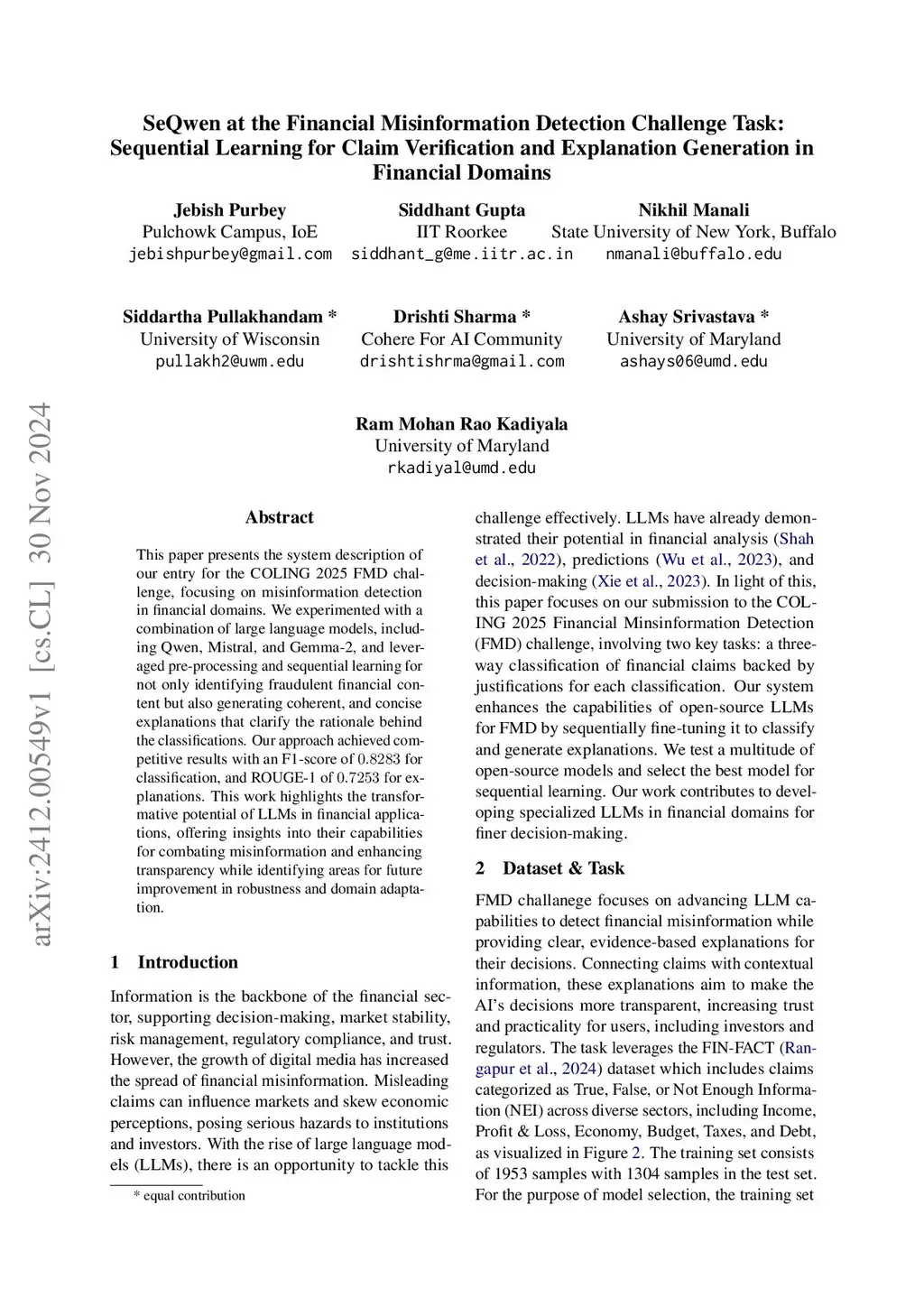 This paper presents the system description of our entry for the COLING 2025 FMD challenge, focusing on misinformation detection in financial domains. We experimented with a combination of large language models, including Qwen, Mistral, and Gemma-2, and leveraged pre-processing and sequential learning for not only identifying fraudulent financial content but also generating coherent, and concise explanations that clarify the rationale behind the classifications. Our approach achieved competitive results with an F1-score of 0.8283 for classification, and ROUGE-1 of 0.7253 for explanations. This work highlights the transformative potential of LLMs in financial applications, offering insights into their capabilities for combating misinformation and enhancing transparency while identifying areas for future improvement in robustness and domain adaptation.