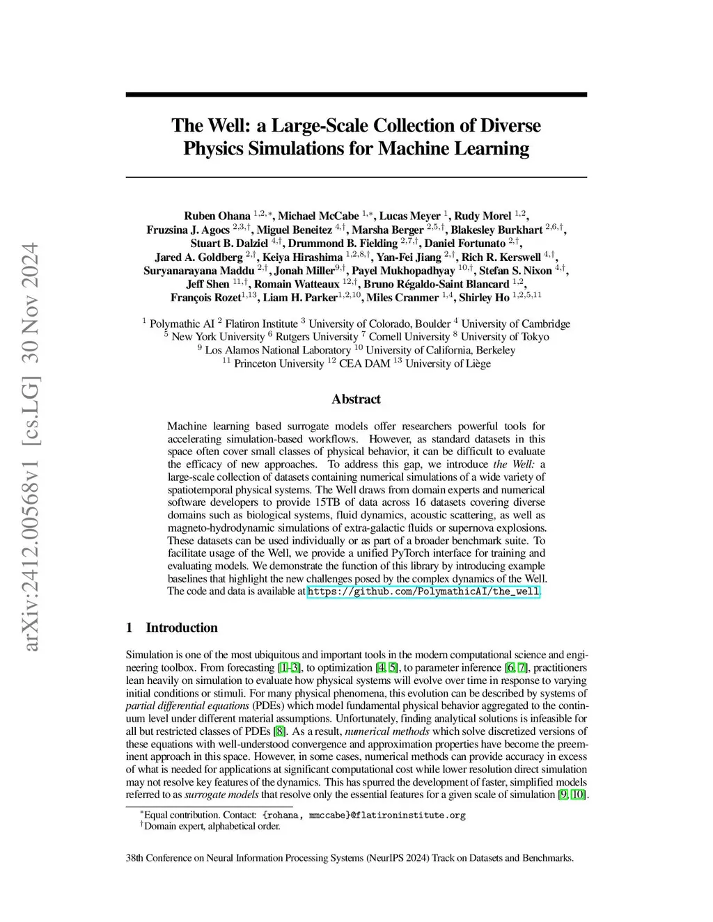Machine learning based surrogate models offer researchers powerful tools for accelerating simulation-based workflows. However, as standard datasets in this space often cover small classes of physical behavior, it can be difficult to evaluate the efficacy of new approaches. To address this gap, we introduce the Well: a large-scale collection of datasets containing numerical simulations of a wide variety of spatiotemporal physical systems. The Well draws from domain experts and numerical software developers to provide 15TB of data across 16 datasets covering diverse domains such as biological systems, fluid dynamics, acoustic scattering, as well as magneto-hydrodynamic simulations of extra-galactic fluids or supernova explosions. These datasets can be used individually or as part of a broader benchmark suite. To facilitate usage of the Well, we provide a unified PyTorch interface for training and evaluating models. We demonstrate the function of this library by introducing example baselines that highlight the new challenges posed by the complex dynamics of the Well. The code and data is available atthis https URL.