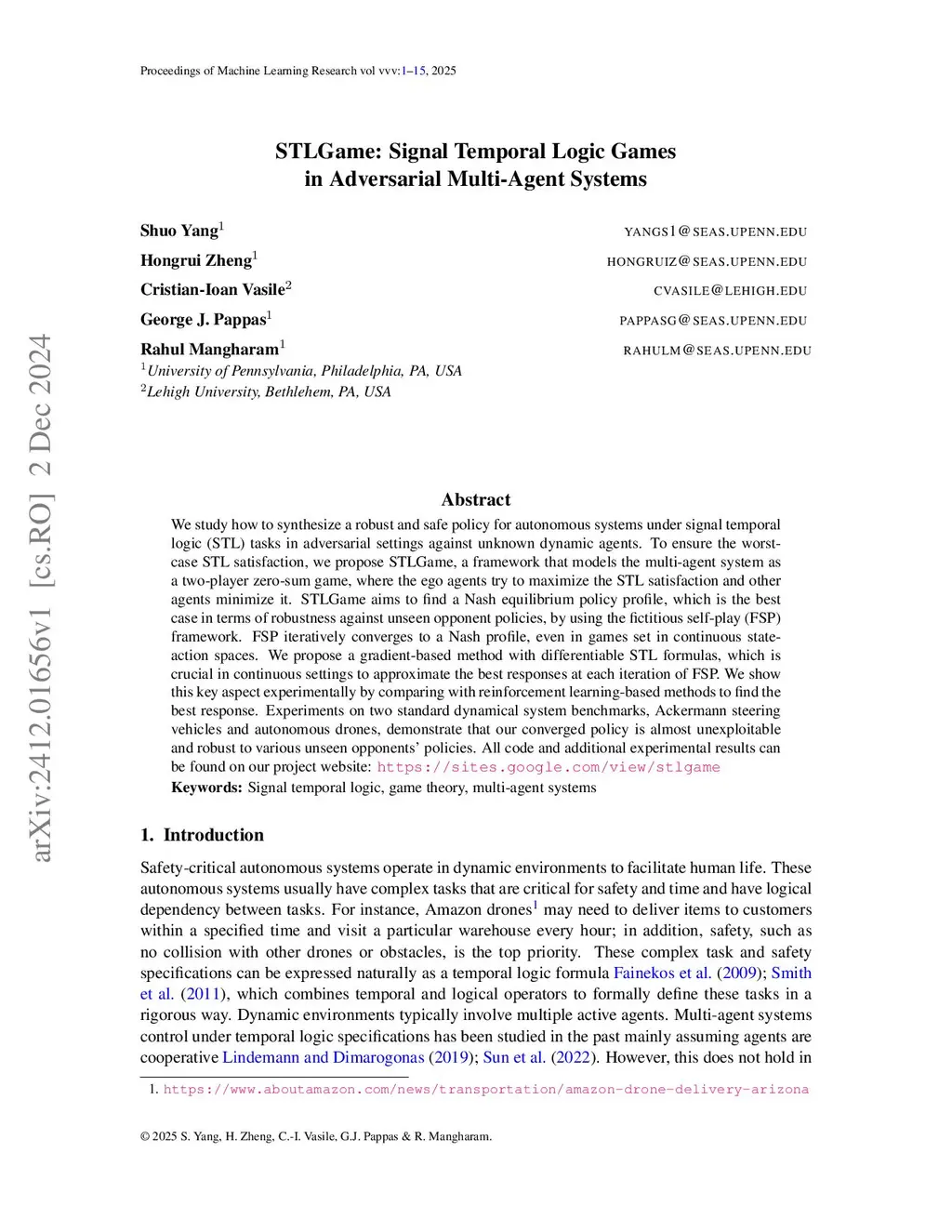 We study how to synthesize a robust and safe policy for autonomous systems under signal temporal logic (STL) tasks in adversarial settings against unknown dynamic agents. To ensure the worst-case STL satisfaction, we propose STLGame, a framework that models the multi-agent system as a two-player zero-sum game, where the ego agents try to maximize the STL satisfaction and other agents minimize it. STLGame aims to find a Nash equilibrium policy profile, which is the best case in terms of robustness against unseen opponent policies, by using the fictitious self-play (FSP) framework. FSP iteratively converges to a Nash profile, even in games set in continuous state-action spaces. We propose a gradient-based method with differentiable STL formulas, which is crucial in continuous settings to approximate the best responses at each iteration of FSP. We show this key aspect experimentally by comparing with reinforcement learning-based methods to find the best response. Experiments on two standard dynamical system benchmarks, Ackermann steering vehicles and autonomous drones, demonstrate that our converged policy is almost unexploitable and robust to various unseen opponents' policies. All code and additional experimental results can be found on our project website: https://sites.google.com/view/stlgame