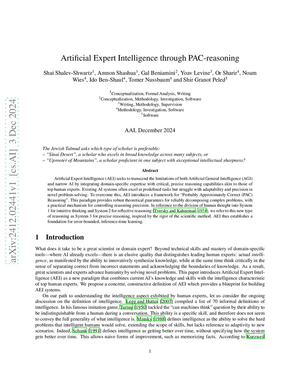 Artificial Expert Intelligence (AEI) seeks to transcend the limitations of both Artificial General Intelligence (AGI) and narrow AI by integrating domain-specific expertise with critical, precise reasoning capabilities akin to those of top human experts. Existing AI systems often excel at predefined tasks but struggle with adaptability and precision in novel problem-solving. To overcome this, AEI introduces a framework for ``Probably Approximately Correct (PAC) Reasoning". This paradigm provides robust theoretical guarantees for reliably decomposing complex problems, with a practical mechanism for controlling reasoning precision. In reference to the division of human thought into System 1 for intuitive thinking and System 2 for reflective reasoning~\citep{tversky1974judgment}, we refer to this new type of reasoning as System 3 for precise reasoning, inspired by the rigor of the scientific method. AEI thus establishes a foundation for error-bounded, inference-time learning.