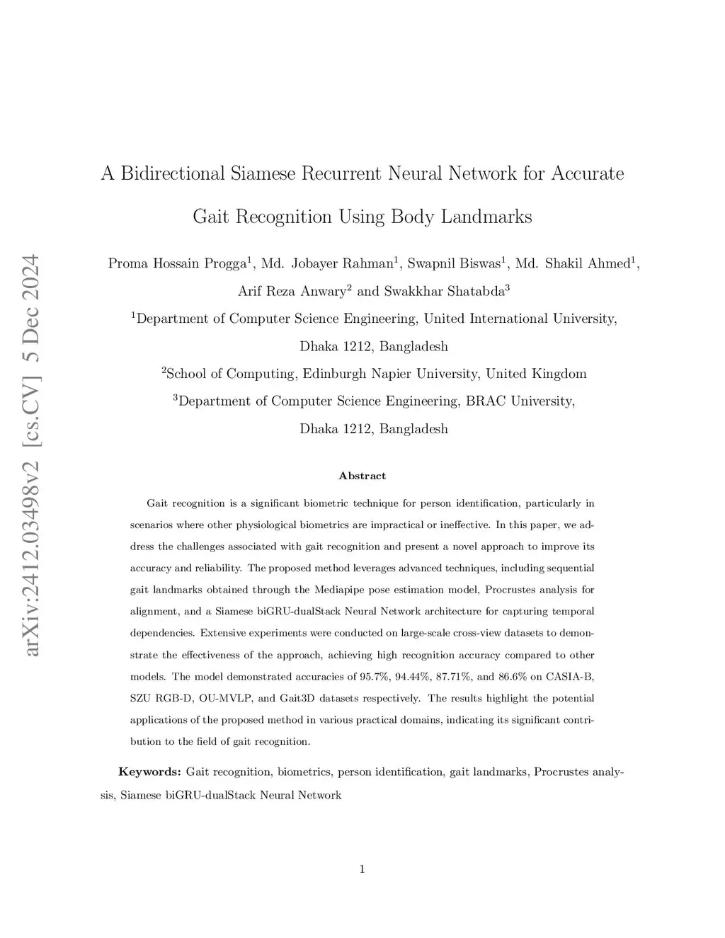Gait recognition is a significant biometric technique for person identification, particularly in scenarios where other physiological biometrics are impractical or ineffective. In this paper, we address the challenges associated with gait recognition and present a novel approach to improve its accuracy and reliability. The proposed method leverages advanced techniques, including sequential gait landmarks obtained through the Mediapipe pose estimation model, Procrustes analysis for alignment, and a Siamese biGRU-dualStack Neural Network architecture for capturing temporal dependencies. Extensive experiments were conducted on large-scale cross-view datasets to demonstrate the effectiveness of the approach, achieving high recognition accuracy compared to other models. The model demonstrated accuracies of 95.7%, 94.44%, 87.71%, and 86.6% on CASIA-B, SZU RGB-D, OU-MVLP, and Gait3D datasets respectively. The results highlight the potential applications of the proposed method in various practical domains, indicating its significant contribution to the field of gait recognition.