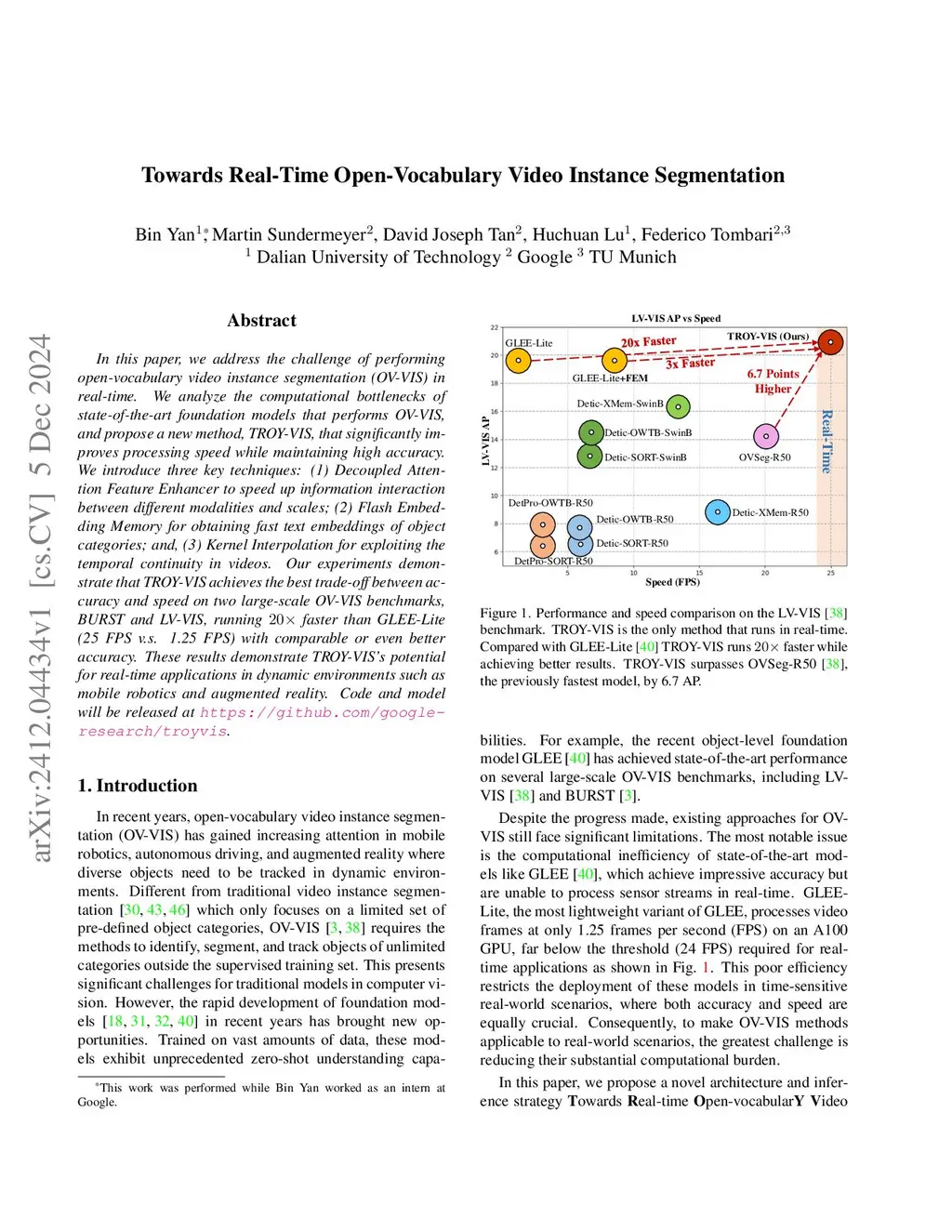 In this paper, we address the challenge of performing open-vocabulary video instance segmentation (OV-VIS) in real-time. We analyze the computational bottlenecks of state-of-the-art foundation models that performs OV-VIS, and propose a new method, TROY-VIS, that significantly improves processing speed while maintaining high accuracy. We introduce three key techniques: (1) Decoupled Attention Feature Enhancer to speed up information interaction between different modalities and scales; (2) Flash Embedding Memory for obtaining fast text embeddings of object categories; and, (3) Kernel Interpolation for exploiting the temporal continuity in videos. Our experiments demonstrate that TROY-VIS achieves the best trade-off between accuracy and speed on two large-scale OV-VIS benchmarks, BURST and LV-VIS, running 20x faster than GLEE-Lite (25 FPS v.s. 1.25 FPS) with comparable or even better accuracy. These results demonstrate TROY-VIS's potential for real-time applications in dynamic environments such as mobile robotics and augmented reality. Code and model will be released at https://github.com/google-research/troyvis.