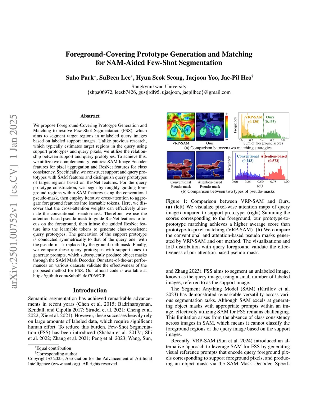 We propose Foreground-Covering Prototype Generation and Matching to resolve Few-Shot Segmentation (FSS), which aims to segment target regions in unlabeled query images based on labeled support images. Unlike previous research, which typically estimates target regions in the query using support prototypes and query pixels, we utilize the relationship between support and query prototypes. To achieve this, we utilize two complementary features: SAM Image Encoder features for pixel aggregation and ResNet features for class consistency. Specifically, we construct support and query prototypes with SAM features and distinguish query prototypes of target regions based on ResNet features. For the query prototype construction, we begin by roughly guiding foreground regions within SAM features using the conventional pseudo-mask, then employ iterative cross-attention to aggregate foreground features into learnable tokens. Here, we discover that the cross-attention weights can effectively alternate the conventional pseudo-mask. Therefore, we use the attention-based pseudo-mask to guide ResNet features to focus on the foreground, then infuse the guided ResNet feature into the learnable tokens to generate class-consistent query prototypes. The generation of the support prototype is conducted symmetrically to that of the query one, with the pseudo-mask replaced by the ground-truth mask. Finally, we compare these query prototypes with support ones to generate prompts, which subsequently produce object masks through the SAM Mask Decoder. Our state-of-the-art performances on various datasets validate the effectiveness of the proposed method for FSS. Our official code is available atthis https URL