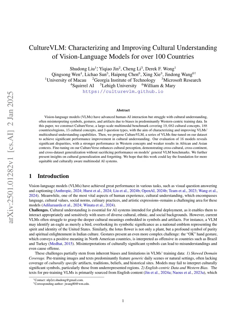Vision-language models (VLMs) have advanced human-AI interaction but struggle with cultural understanding, often misinterpreting symbols, gestures, and artifacts due to biases in predominantly Western-centric training data. In this paper, we construct CultureVerse, a large-scale multimodal benchmark covering 19, 682 cultural concepts, 188 countries/regions, 15 cultural concepts, and 3 question types, with the aim of characterizing and improving VLMs' multicultural understanding capabilities. Then, we propose CultureVLM, a series of VLMs fine-tuned on our dataset to achieve significant performance improvement in cultural understanding. Our evaluation of 16 models reveals significant disparities, with a stronger performance in Western concepts and weaker results in African and Asian contexts. Fine-tuning on our CultureVerse enhances cultural perception, demonstrating cross-cultural, cross-continent, and cross-dataset generalization without sacrificing performance on models' general VLM benchmarks. We further present insights on cultural generalization and forgetting. We hope that this work could lay the foundation for more equitable and culturally aware multimodal AI systems.