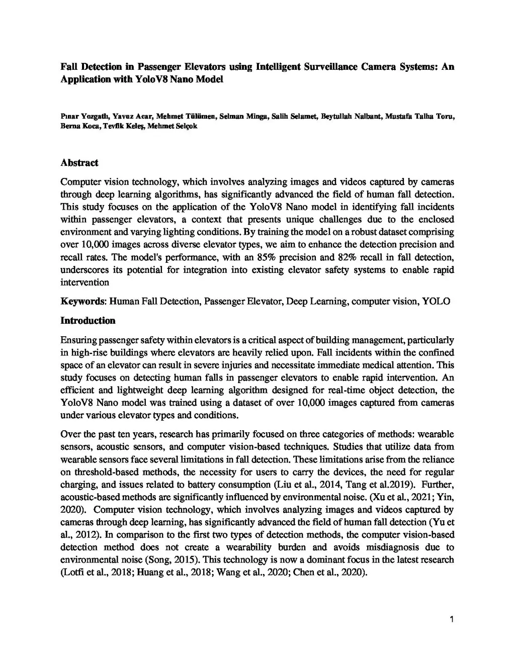 Fall Detection in Passenger Elevators using Intelligent Surveillance Camera Systems: An Application with YoloV8 Nano Model