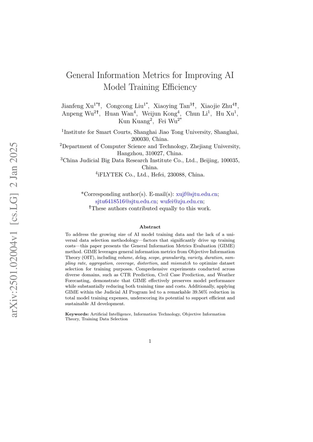 To address the growing size of AI model training data and the lack of a universal data selection methodology-factors that significantly drive up training costs -- this paper presents the General Information Metrics Evaluation (GIME) method. GIME leverages general information metrics from Objective Information Theory (OIT), including volume, delay, scope, granularity, variety, duration, sampling rate, aggregation, coverage, distortion, and mismatch to optimize dataset selection for training purposes. Comprehensive experiments conducted across diverse domains, such as CTR Prediction, Civil Case Prediction, and Weather Forecasting, demonstrate that GIME effectively preserves model performance while substantially reducing both training time and costs. Additionally, applying GIME within the Judicial AI Program led to a remarkable 39.56% reduction in total model training expenses, underscoring its potential to support efficient and sustainable AI development.