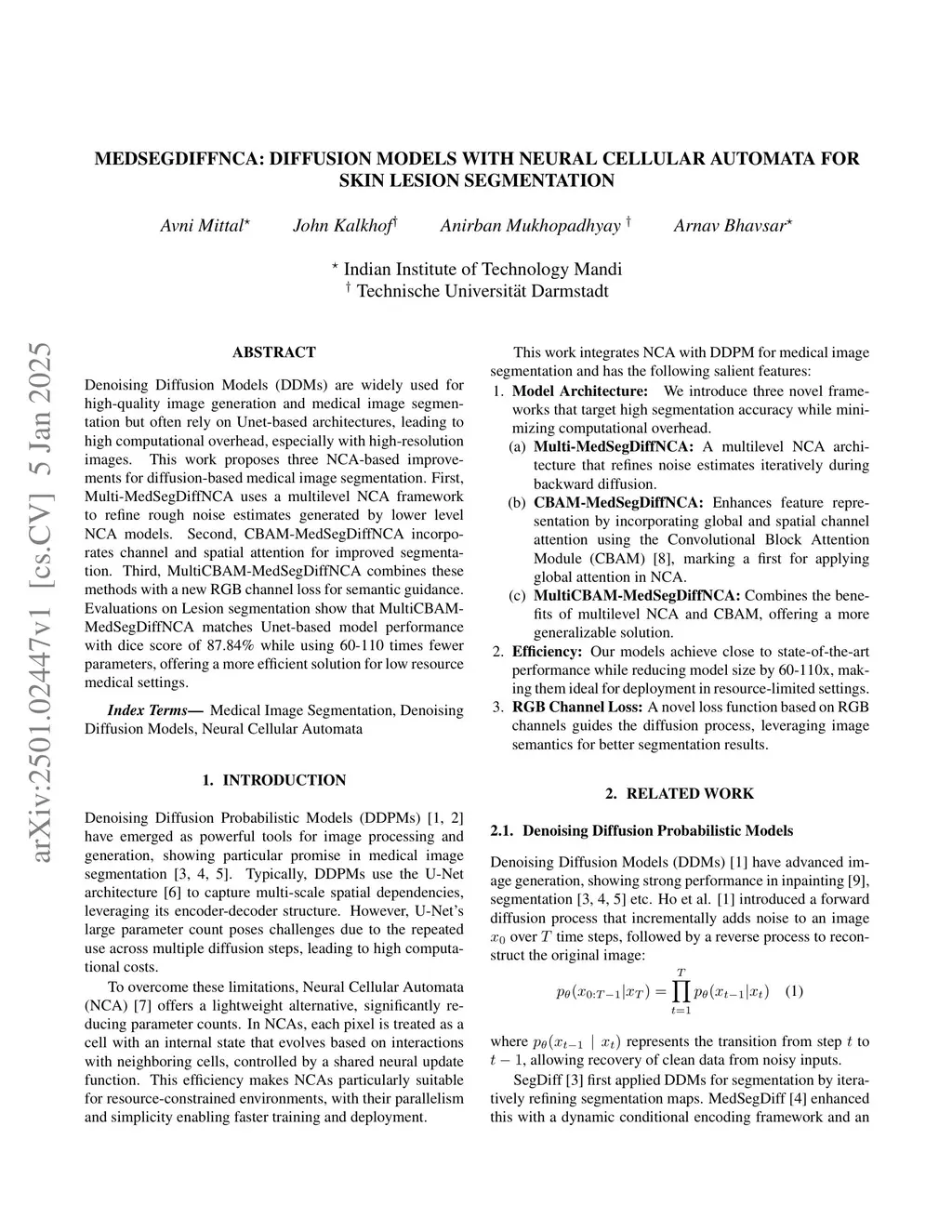 Denoising Diffusion Models (DDMs) are widely used for high-quality image generation and medical image segmentation but often rely on Unet-based architectures, leading to high computational overhead, especially with high-resolution images. This work proposes three NCA-based improvements for diffusion-based medical image segmentation. First, Multi-MedSegDiffNCA uses a multilevel NCA framework to refine rough noise estimates generated by lower level NCA models. Second, CBAM-MedSegDiffNCA incorporates channel and spatial attention for improved segmentation. Third, MultiCBAM-MedSegDiffNCA combines these methods with a new RGB channel loss for semantic guidance. Evaluations on Lesion segmentation show that MultiCBAM-MedSegDiffNCA matches Unet-based model performance with dice score of 87.84% while using 60-110 times fewer parameters, offering a more efficient solution for low resource medical settings.