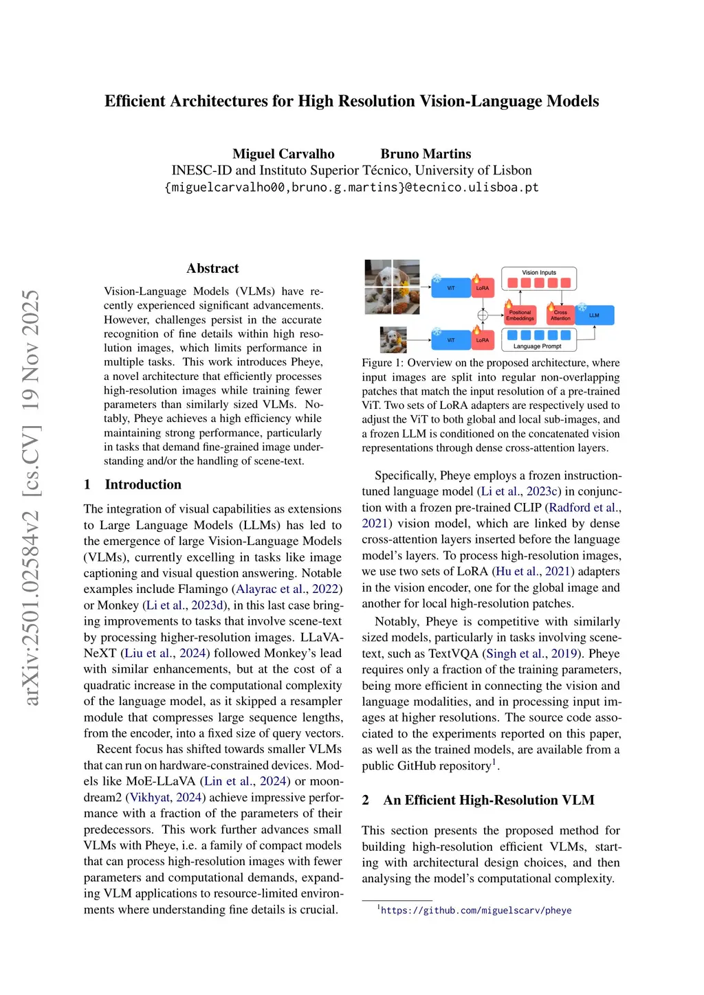 Vision-Language Models (VLMs) have recently experienced significant advancements. However, challenges persist in the accurate recognition of fine details within high resolution images, which limits performance in multiple tasks. This work introduces Pheye, a novel architecture that efficiently processes high-resolution images while training fewer parameters than similarly sized VLMs. Notably, Pheye achieves a high efficiency while maintaining strong performance, particularly in tasks that demand fine-grained image understanding and/or the handling of scene-text.