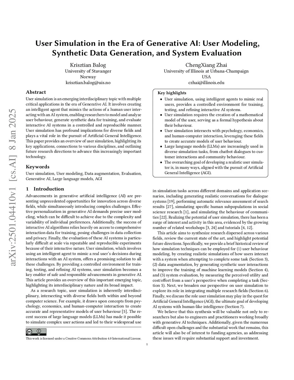 User simulation is an emerging interdisciplinary topic with multiple critical applications in the era of Generative AI. It involves creating an intelligent agent that mimics the actions of a human user interacting with an AI system, enabling researchers to model and analyze user behaviour, generate synthetic data for training, and evaluate interactive AI systems in a controlled and reproducible manner. User simulation has profound implications for diverse fields and plays a vital role in the pursuit of Artificial General Intelligence. This paper provides an overview of user simulation, highlighting its key applications, connections to various disciplines, and outlining future research directions to advance this increasingly important technology.