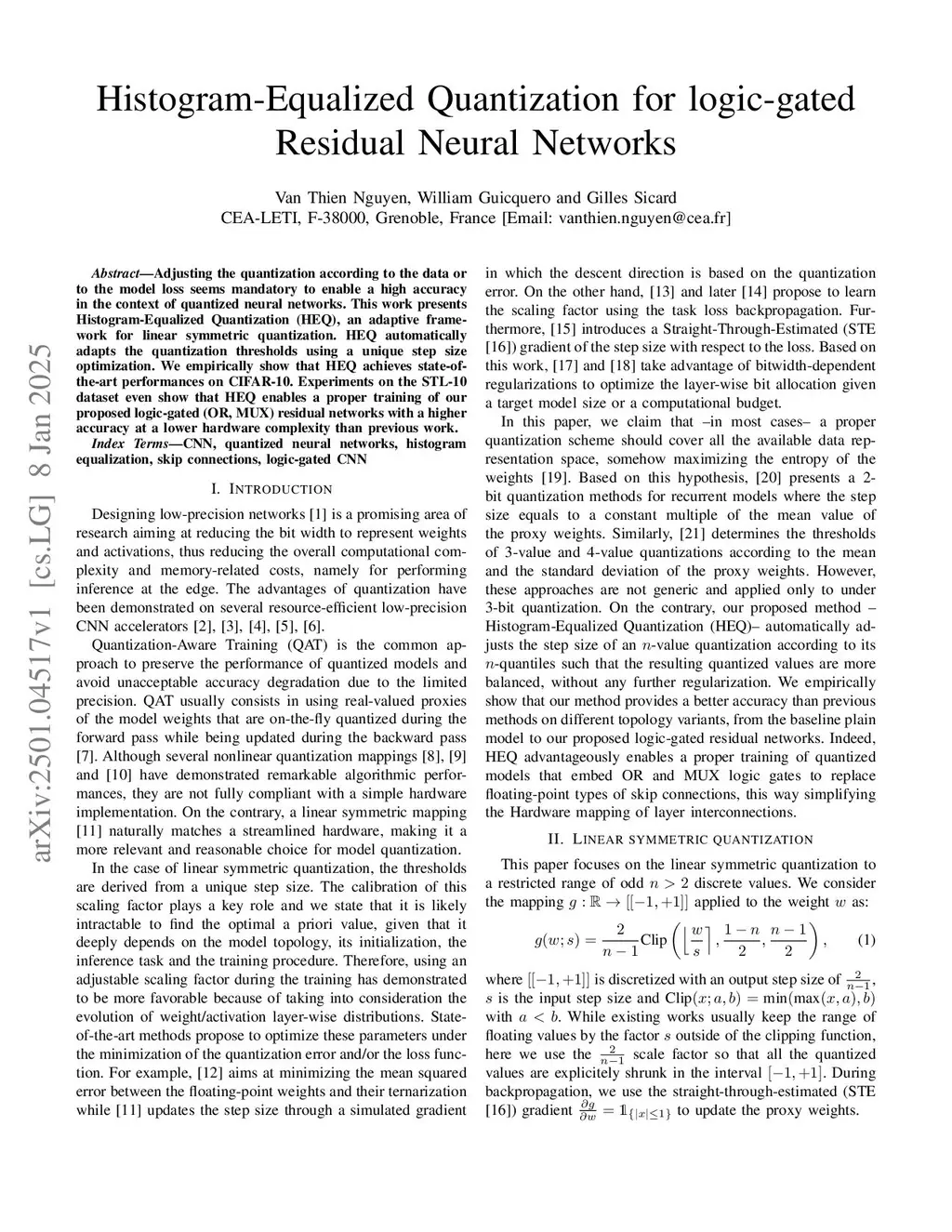 Adjusting the quantization according to the data or to the model loss seems mandatory to enable a high accuracy in the context of quantized neural networks. This work presents Histogram-Equalized Quantization (HEQ), an adaptive framework for linear symmetric quantization. HEQ automatically adapts the quantization thresholds using a unique step size optimization. We empirically show that HEQ achieves state-of-the-art performances on CIFAR-10. Experiments on the STL-10 dataset even show that HEQ enables a proper training of our proposed logic-gated (OR, MUX) residual networks with a higher accuracy at a lower hardware complexity than previous work.