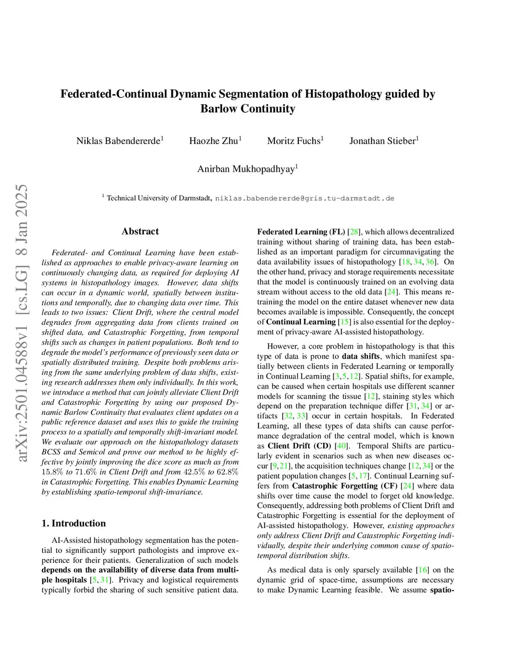 Federated- and Continual Learning have been established as approaches to enable privacy-aware learning on continuously changing data, as required for deploying AI systems in histopathology images. However, data shifts can occur in a dynamic world, spatially between institutions and temporally, due to changing data over time. This leads to two issues: Client Drift, where the central model degrades from aggregating data from clients trained on shifted data, and Catastrophic Forgetting, from temporal shifts such as changes in patient populations. Both tend to degrade the model's performance of previously seen data or spatially distributed training. Despite both problems arising from the same underlying problem of data shifts, existing research addresses them only individually. In this work, we introduce a method that can jointly alleviate Client Drift and Catastrophic Forgetting by using our proposed Dynamic Barlow Continuity that evaluates client updates on a public reference dataset and uses this to guide the training process to a spatially and temporally shift-invariant model. We evaluate our approach on the histopathology datasets BCSS and Semicol and prove our method to be highly effective by jointly improving the dice score as much as from 15.8% to 71.6% in Client Drift and from 42.5% to 62.8% in Catastrophic Forgetting. This enables Dynamic Learning by establishing spatio-temporal shift-invariance.