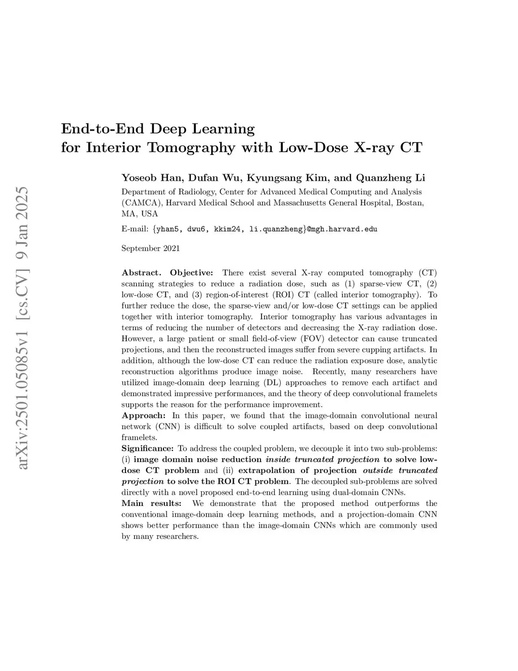 Objective: There exist several X-ray computed tomography (CT) scanning strategies to reduce a radiation dose, such as (1) sparse-view CT, (2) low-dose CT, and (3) region-of-interest (ROI) CT (called interior tomography). To further reduce the dose, the sparse-view and/or low-dose CT settings can be applied together with interior tomography. Interior tomography has various advantages in terms of reducing the number of detectors and decreasing the X-ray radiation dose. However, a large patient or small field-of-view (FOV) detector can cause truncated projections, and then the reconstructed images suffer from severe cupping artifacts. In addition, although the low-dose CT can reduce the radiation exposure dose, analytic reconstruction algorithms produce image noise. Recently, many researchers have utilized image-domain deep learning (DL) approaches to remove each artifact and demonstrated impressive performances, and the theory of deep convolutional framelets supports the reason for the performance improvement. Approach: In this paper, we found that the image-domain convolutional neural network (CNN) is difficult to solve coupled artifacts, based on deep convolutional framelets. Significance: To address the coupled problem, we decouple it into two sub-problems: (i) image domain noise reduction inside truncated projection to solve low-dose CT problem and (ii) extrapolation of projection outside truncated projection to solve the ROI CT problem. The decoupled sub-problems are solved directly with a novel proposed end-to-end learning using dual-domain CNNs. Main results: We demonstrate that the proposed method outperforms the conventional image-domain deep learning methods, and a projection-domain CNN shows better performance than the image-domain CNNs which are commonly used by many researchers.
