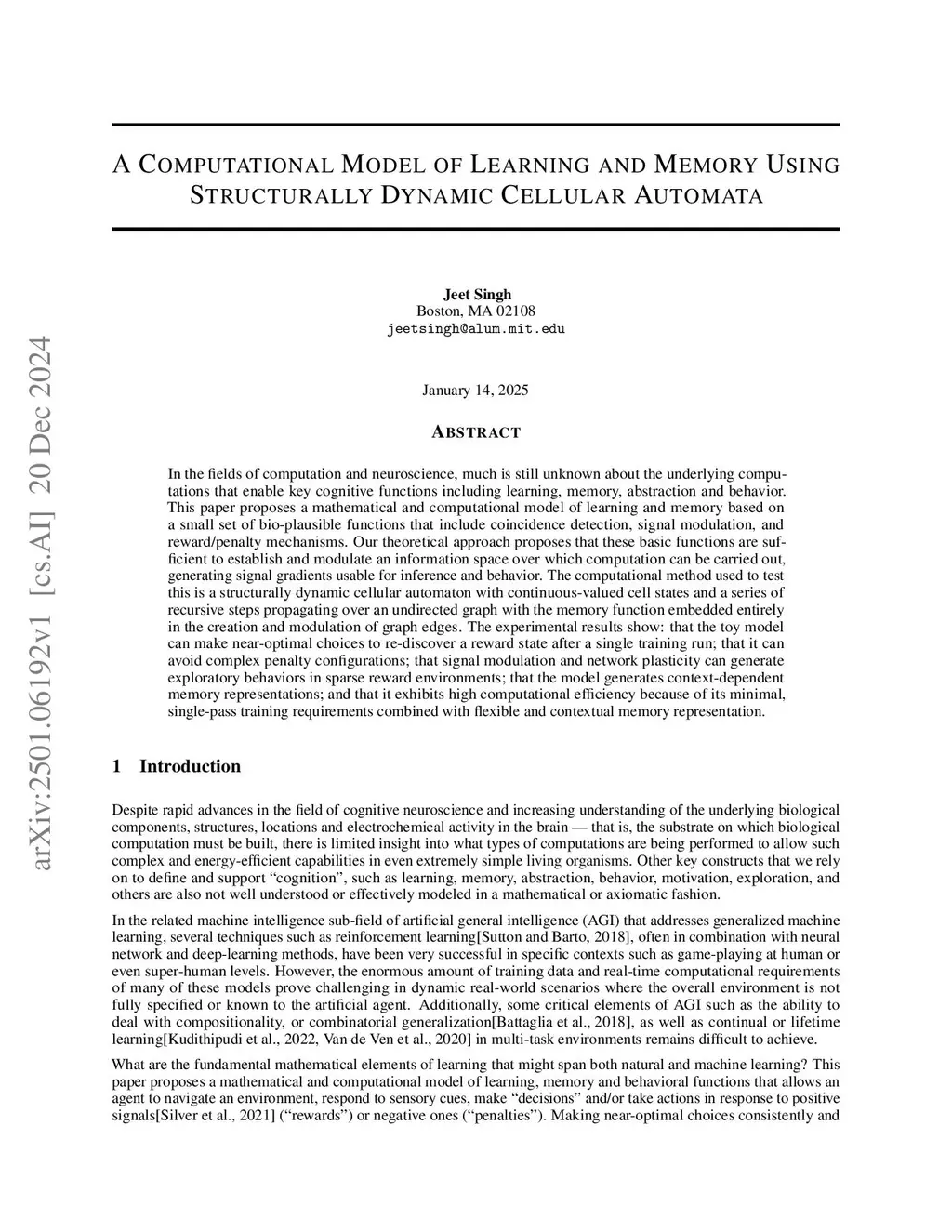 In the fields of computation and neuroscience, much is still unknown about the underlying computations that enable key cognitive functions including learning, memory, abstraction and behavior. This paper proposes a mathematical and computational model of learning and memory based on a small set of bio-plausible functions that include coincidence detection, signal modulation, and reward/penalty mechanisms. Our theoretical approach proposes that these basic functions are sufficient to establish and modulate an information space over which computation can be carried out, generating signal gradients usable for inference and behavior. The computational method used to test this is a structurally dynamic cellular automaton with continuous-valued cell states and a series of recursive steps propagating over an undirected graph with the memory function embedded entirely in the creation and modulation of graph edges. The experimental results show: that the toy model can make near-optimal choices to re-discover a reward state after a single training run; that it can avoid complex penalty configurations; that signal modulation and network plasticity can generate exploratory behaviors in sparse reward environments; that the model generates context-dependent memory representations; and that it exhibits high computational efficiency because of its minimal, single-pass training requirements combined with flexible and contextual memory representation.