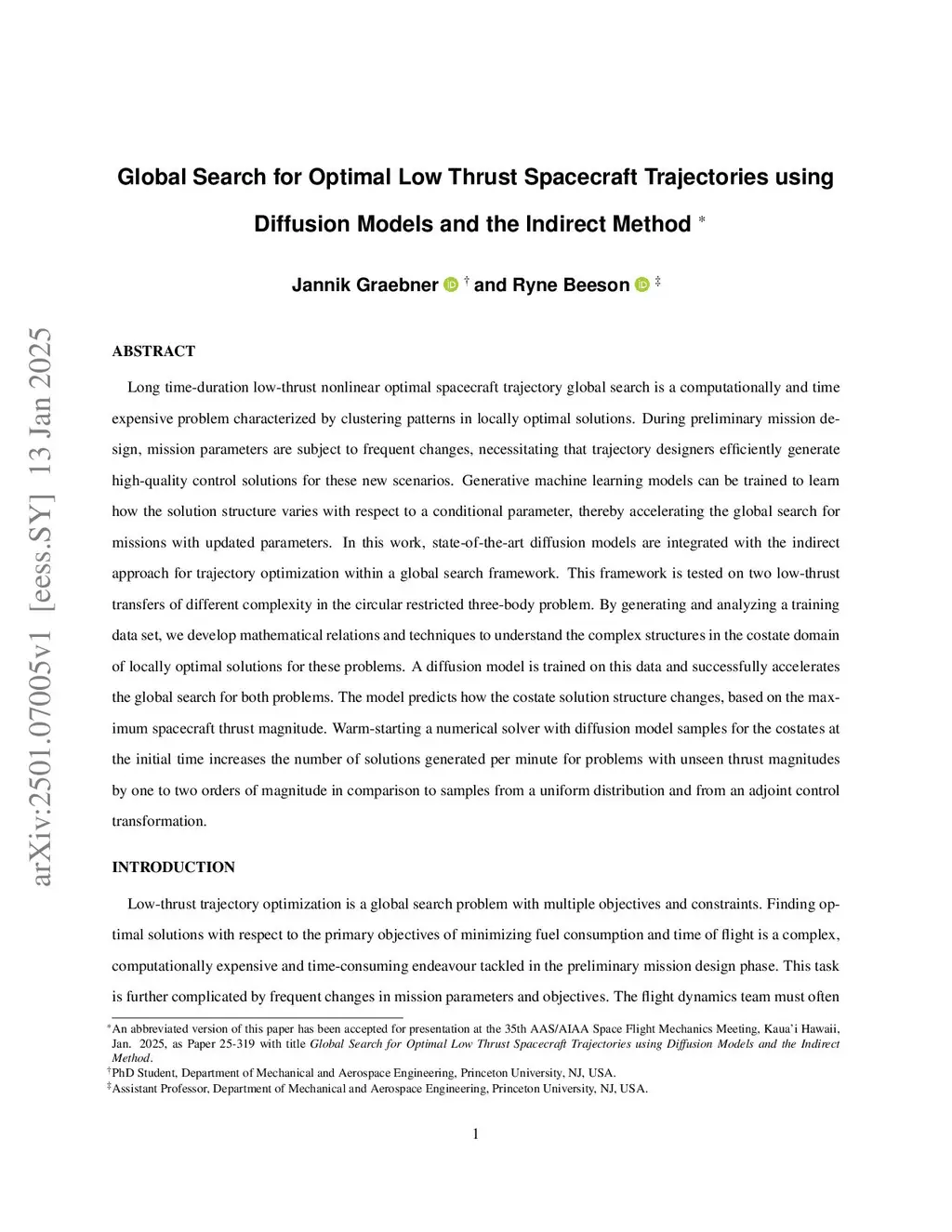 Long time-duration low-thrust nonlinear optimal spacecraft trajectory global search is a computationally and time expensive problem characterized by clustering patterns in locally optimal solutions. During preliminary mission design, mission parameters are subject to frequent changes, necessitating that trajectory designers efficiently generate high-quality control solutions for these new scenarios. Generative machine learning models can be trained to learn how the solution structure varies with respect to a conditional parameter, thereby accelerating the global search for missions with updated parameters. In this work, state-of-the-art diffusion models are integrated with the indirect approach for trajectory optimization within a global search framework. This framework is tested on two low-thrust transfers of different complexity in the circular restricted three-body problem. By generating and analyzing a training data set, we develop mathematical relations and techniques to understand the complex structures in the costate domain of locally optimal solutions for these problems. A diffusion model is trained on this data and successfully accelerates the global search for both problems. The model predicts how the costate solution structure changes, based on the maximum spacecraft thrust magnitude. Warm-starting a numerical solver with diffusion model samples for the costates at the initial time increases the number of solutions generated per minute for problems with unseen thrust magnitudes by one to two orders of magnitude in comparison to samples from a uniform distribution and from an adjoint control transformation.