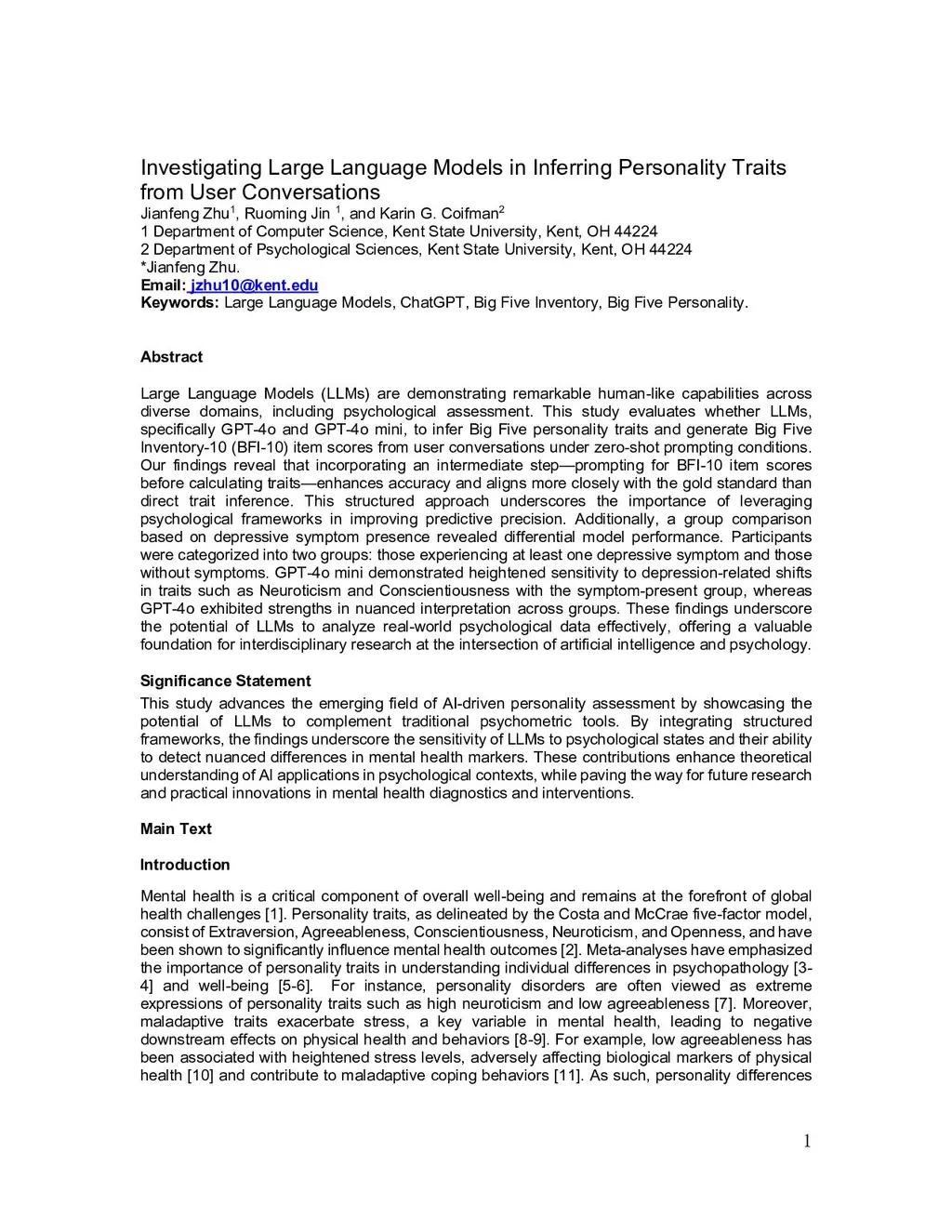 Large Language Models (LLMs) are demonstrating remarkable human like capabilities across diverse domains, including psychological assessment. This study evaluates whether LLMs, specifically GPT-4o and GPT-4o mini, can infer Big Five personality traits and generate Big Five Inventory-10 (BFI-10) item scores from user conversations under zero-shot prompting conditions. Our findings reveal that incorporating an intermediate step--prompting for BFI-10 item scores before calculating traits--enhances accuracy and aligns more closely with the gold standard than direct trait inference. This structured approach underscores the importance of leveraging psychological frameworks in improving predictive precision. Additionally, a group comparison based on depressive symptom presence revealed differential model performance. Participants were categorized into two groups: those experiencing at least one depressive symptom and those without symptoms. GPT-4o mini demonstrated heightened sensitivity to depression-related shifts in traits such as Neuroticism and Conscientiousness within the symptom-present group, whereas GPT-4o exhibited strengths in nuanced interpretation across groups. These findings underscore the potential of LLMs to analyze real-world psychological data effectively, offering a valuable foundation for interdisciplinary research at the intersection of artificial intelligence and psychology.