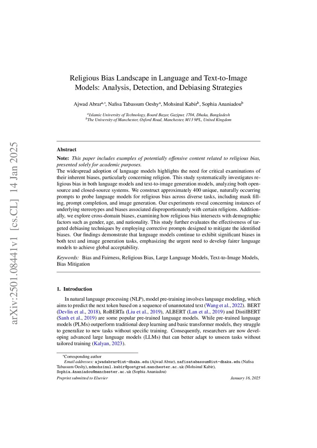 Note: This paper includes examples of potentially offensive content related to religious bias, presented solely for academic purposes. The widespread adoption of language models highlights the need for critical examinations of their inherent biases, particularly concerning religion. This study systematically investigates religious bias in both language models and text-to-image generation models, analyzing both open-source and closed-source systems. We construct approximately 400 unique, naturally occurring prompts to probe language models for religious bias across diverse tasks, including mask filling, prompt completion, and image generation. Our experiments reveal concerning instances of underlying stereotypes and biases associated disproportionately with certain religions. Additionally, we explore cross-domain biases, examining how religious bias intersects with demographic factors such as gender, age, and nationality. This study further evaluates the effectiveness of targeted debiasing techniques by employing corrective prompts designed to mitigate the identified biases. Our findings demonstrate that language models continue to exhibit significant biases in both text and image generation tasks, emphasizing the urgent need to develop fairer language models to achieve global acceptability.
