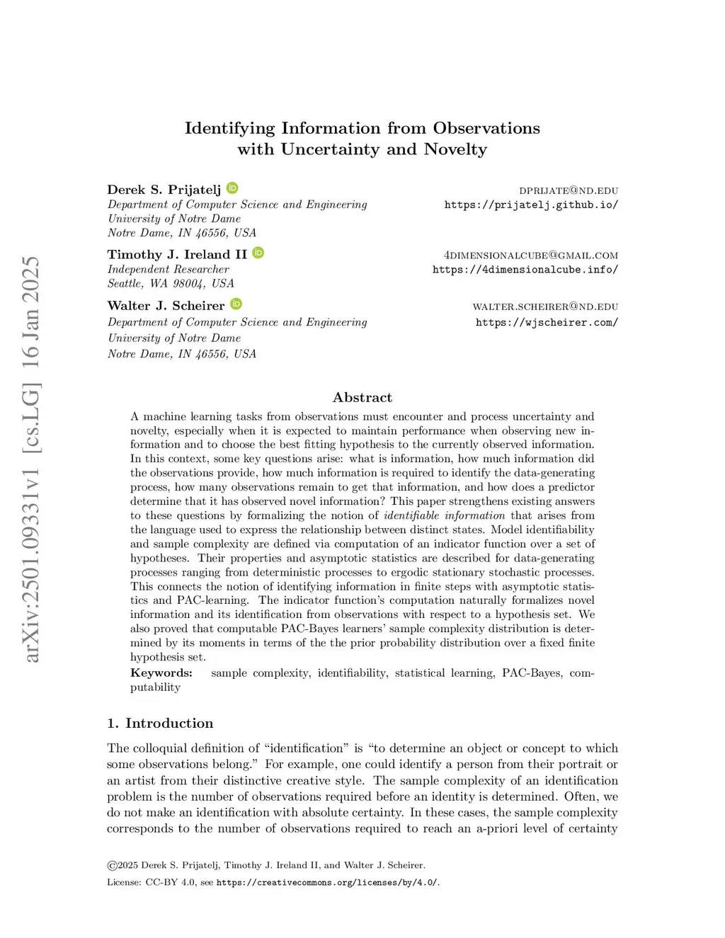 A machine learning tasks from observations must encounter and process uncertainty and novelty, especially when it is to maintain performance when observing new information and to choose the hypothesis that best fits the current observations. In this context, some key questions arise: what and how much information did the observations provide, how much information is required to identify the data-generating process, how many observations remain to get that information, and how does a predictor determine that it has observed novel information? This paper strengthens existing answers to these questions by formalizing the notion of identifiable information that arises from the language used to express the relationship between distinct states. Model identifiability and sample complexity are defined via computation of an indicator function over a set of hypotheses, bridging algorithmic and probabilistic information. Their properties and asymptotic statistics are described for data-generating processes ranging from deterministic processes to ergodic stationary stochastic processes. This connects the notion of identifying information in finite steps with asymptotic statistics and PAC-learning. The indicator function's computation naturally formalizes novel information and its identification from observations with respect to a hypothesis set. We also proved that computable PAC-Bayes learners' sample complexity distribution is determined by its moments in terms of the prior probability distribution over a fixed finite hypothesis set.