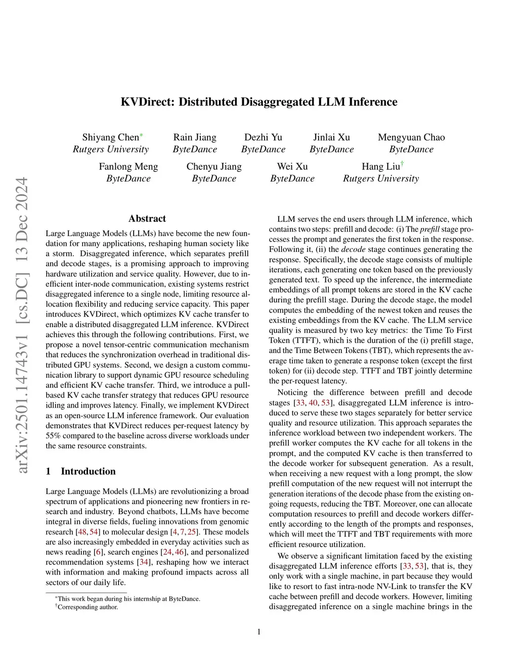 Large Language Models (LLMs) have become the new foundation for many applications, reshaping human society like a storm. Disaggregated inference, which separates prefill and decode stages, is a promising approach to improving hardware utilization and service quality. However, due to inefficient inter-node communication, existing systems restrict disaggregated inference to a single node, limiting resource allocation flexibility and reducing service capacity. This paper introduces KVDirect, which optimizes KV cache transfer to enable a distributed disaggregated LLM inference. KVDirect achieves this through the following contributions. First, we propose a novel tensor-centric communication mechanism that reduces the synchronization overhead in traditional distributed GPU systems. Second, we design a custom communication library to support dynamic GPU resource scheduling and efficient KV cache transfer. Third, we introduce a pull-based KV cache transfer strategy that reduces GPU resource idling and improves latency. Finally, we implement KVDirect as an open-source LLM inference framework. Our evaluation demonstrates that KVDirect reduces per-request latency by 55% compared to the baseline across diverse workloads under the same resource constraints.