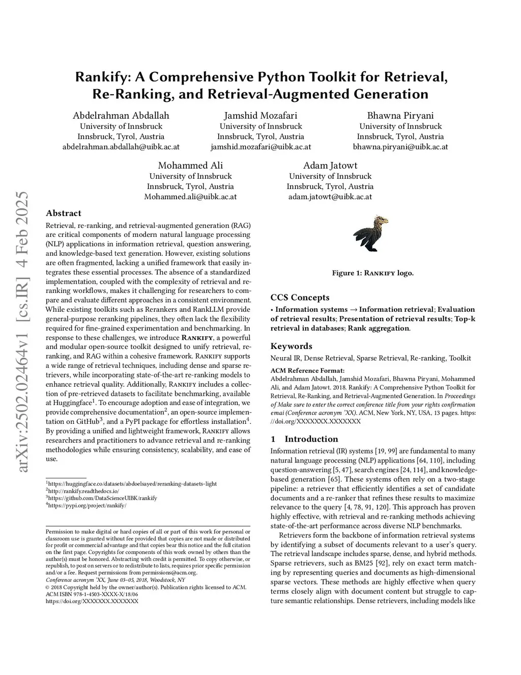 Rankify: A Comprehensive Python Toolkit for Retrieval, Re-Ranking, and Retrieval-Augmented Generation