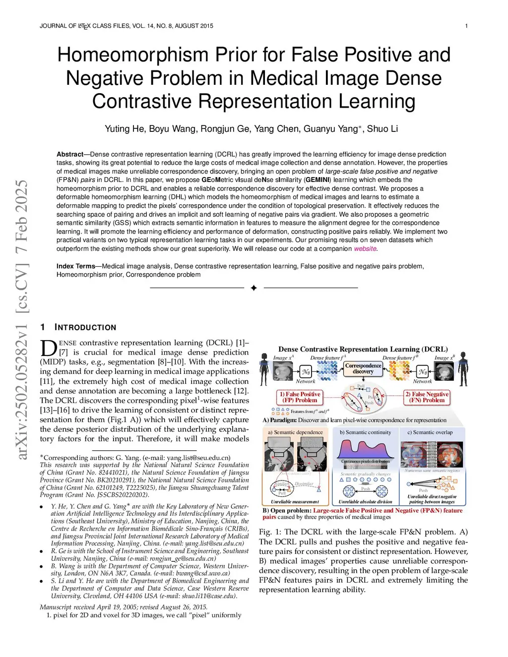 Dense contrastive representation learning (DCRL) has greatly improved the learning efficiency for image-dense prediction tasks, showing its great potential to reduce the large costs of medical image collection and dense annotation. However, the properties of medical images make unreliable correspondence discovery, bringing an open problem of large-scale false positive and negative (FP&N) pairs in DCRL. In this paper, we propose GEoMetric vIsual deNse sImilarity (GEMINI) learning which embeds the homeomorphism prior to DCRL and enables a reliable correspondence discovery for effective dense contrast. We propose a deformable homeomorphism learning (DHL) which models the homeomorphism of medical images and learns to estimate a deformable mapping to predict the pixels' correspondence under topological preservation. It effectively reduces the searching space of pairing and drives an implicit and soft learning of negative pairs via a gradient. We also propose a geometric semantic similarity (GSS) which extracts semantic information in features to measure the alignment degree for the correspondence learning. It will promote the learning efficiency and performance of deformation, constructing positive pairs reliably. We implement two practical variants on two typical representation learning tasks in our experiments. Our promising results on seven datasets which outperform the existing methods show our great superiority. We will release our code on a companion link:this https URL.