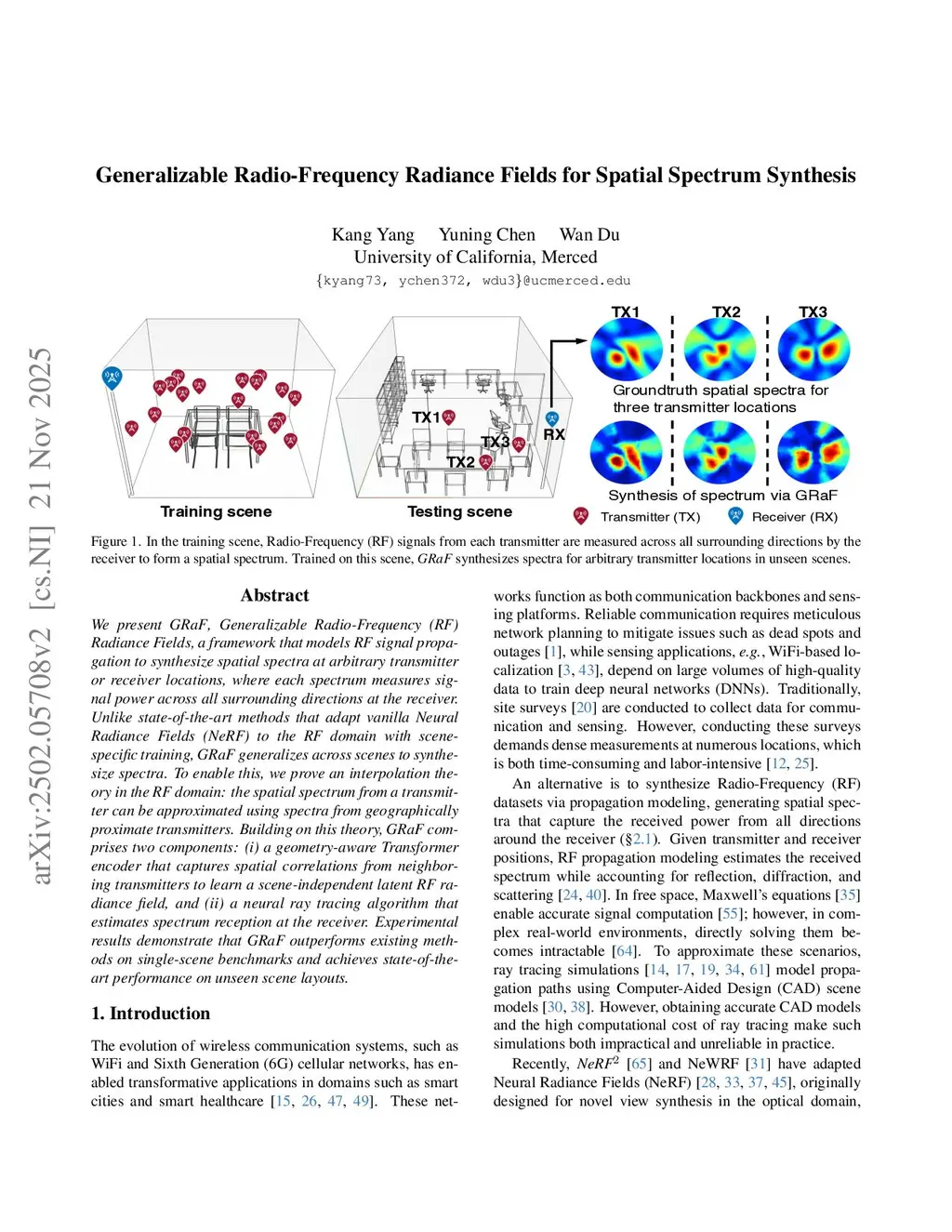 We present GRaF, Generalizable Radio-Frequency (RF) Radiance Fields, a framework that models RF signal propagation to synthesize spatial spectra at arbitrary transmitter or receiver locations, where each spectrum measures signal power across all surrounding directions at the receiver. Unlike state-of-the-art methods that adapt vanilla Neural Radiance Fields (NeRF) to the RF domain with scene-specific training, GRaF generalizes across scenes to synthesize spectra. To enable this, we prove an interpolation theory in the RF domain: the spatial spectrum from a transmitter can be approximated using spectra from geographically proximate transmitters. Building on this theory, GRaF comprises two components: (i) a geometry-aware Transformer encoder that captures spatial correlations from neighboring transmitters to learn a scene-independent latent RF radiance field, and (ii) a neural ray tracing algorithm that estimates spectrum reception at the receiver. Experimental results demonstrate that GRaF outperforms existing methods on single-scene benchmarks and achieves state-of-the-art performance on unseen scene layouts.