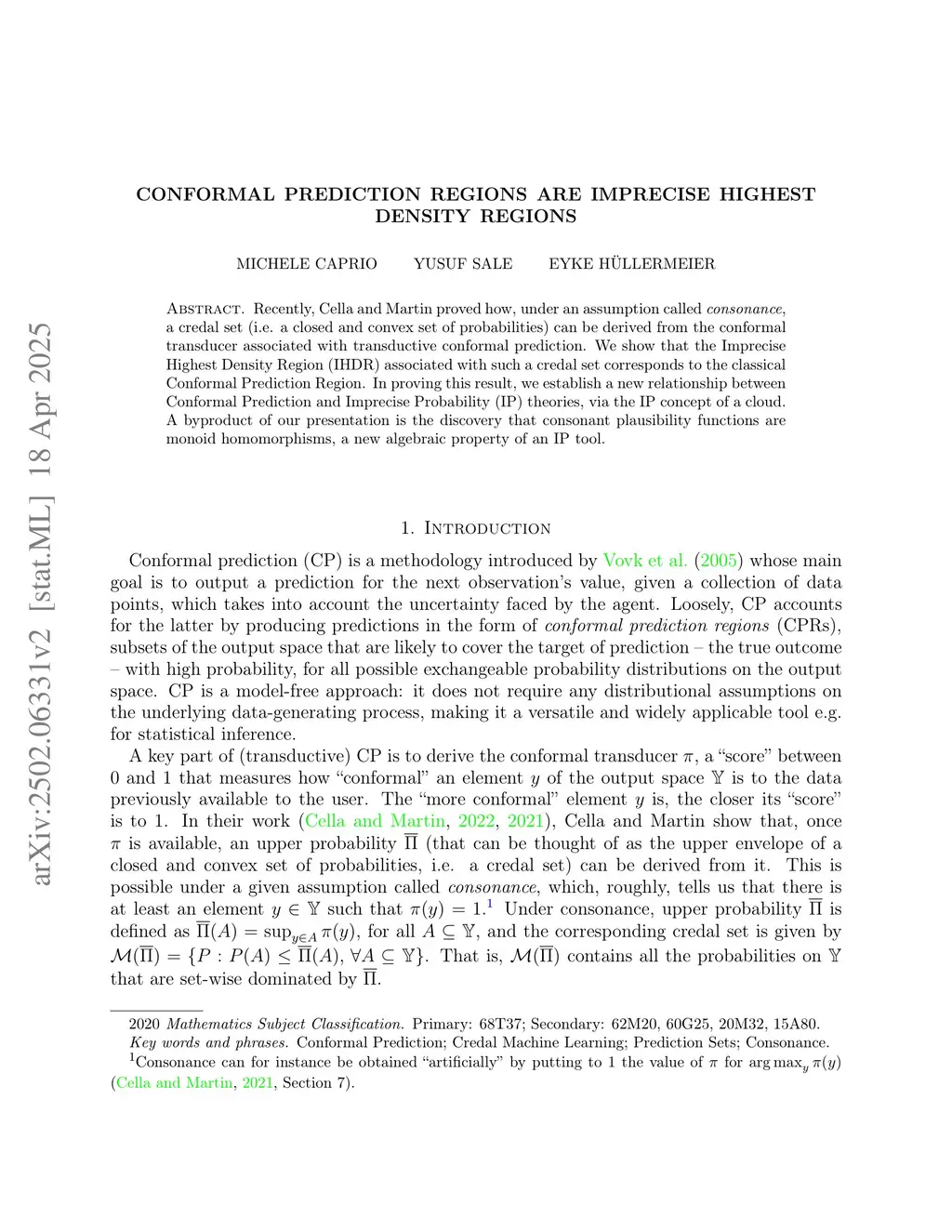 Recently, Cella and Martin proved how, under an assumption called consonance, a credal set (i.e. a closed and convex set of probabilities) can be derived from the conformal transducer associated with transductive conformal prediction. We show that the Imprecise Highest Density Region (IHDR) associated with such a credal set corresponds to the classical Conformal Prediction Region. In proving this result, we establish a new relationship between Conformal Prediction and Imprecise Probability (IP) theories, via the IP concept of a cloud. A byproduct of our presentation is the discovery that consonant plausibility functions are monoid homomorphisms, a new algebraic property of an IP tool.