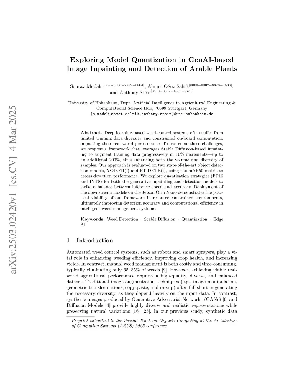 Exploring Model Quantization in GenAI-based Image Inpainting and Detection of Arable Plants