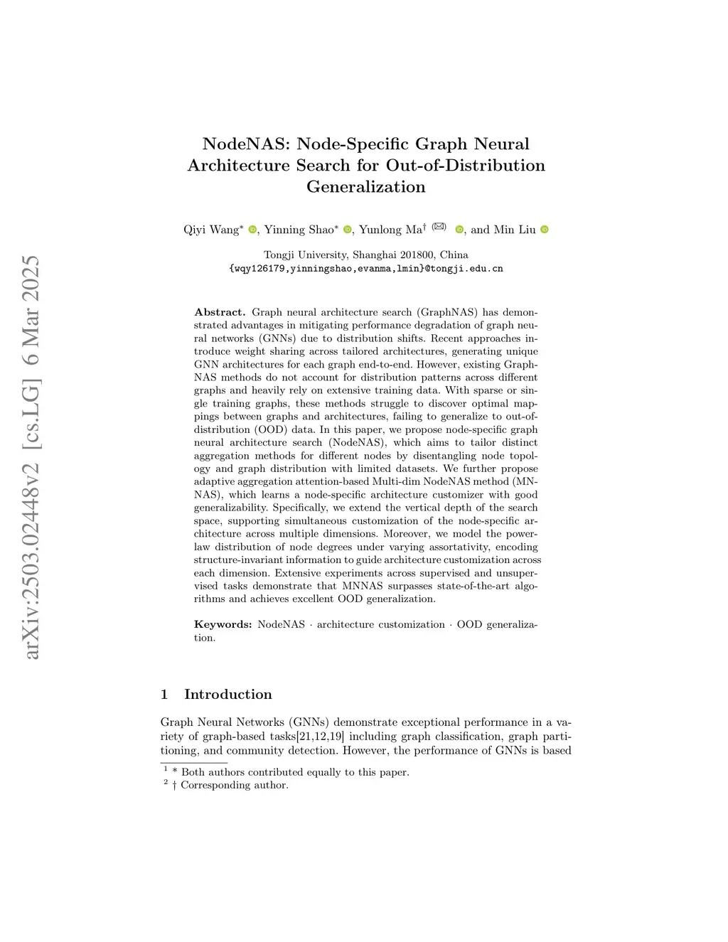 Graph neural architecture search (GraphNAS) has demonstrated advantages in mitigating performance degradation of graph neural networks (GNNs) due to distribution shifts. Recent approaches introduce weight sharing across tailored architectures, generating unique GNN architectures for each graph end-to-end. However, existing GraphNAS methods do not account for distribution patterns across different graphs and heavily rely on extensive training data. With sparse or single training graphs, these methods struggle to discover optimal mappings between graphs and architectures, failing to generalize to out-of-distribution (OOD) data. In this paper, we propose node-specific graph neural architecture search(NodeNAS), which aims to tailor distinct aggregation methods for different nodes through disentangling node topology and graph distribution with limited datasets. We further propose adaptive aggregation attention based Multi-dim NodeNAS method(MNNAS), which learns an node-specific architecture customizer with good generalizability. Specifically, we extend the vertical depth of the search space, supporting simultaneous node-specific architecture customization across multiple dimensions. Moreover, we model the power-law distribution of node degrees under varying assortativity, encoding structure invariant information to guide architecture customization across each dimension. Extensive experiments across supervised and unsupervised tasks demonstrate that MNNAS surpasses state-of-the-art algorithms and achieves excellent OOD generalization.